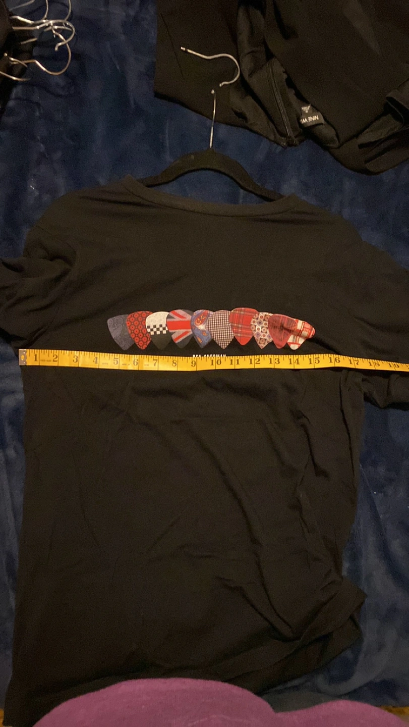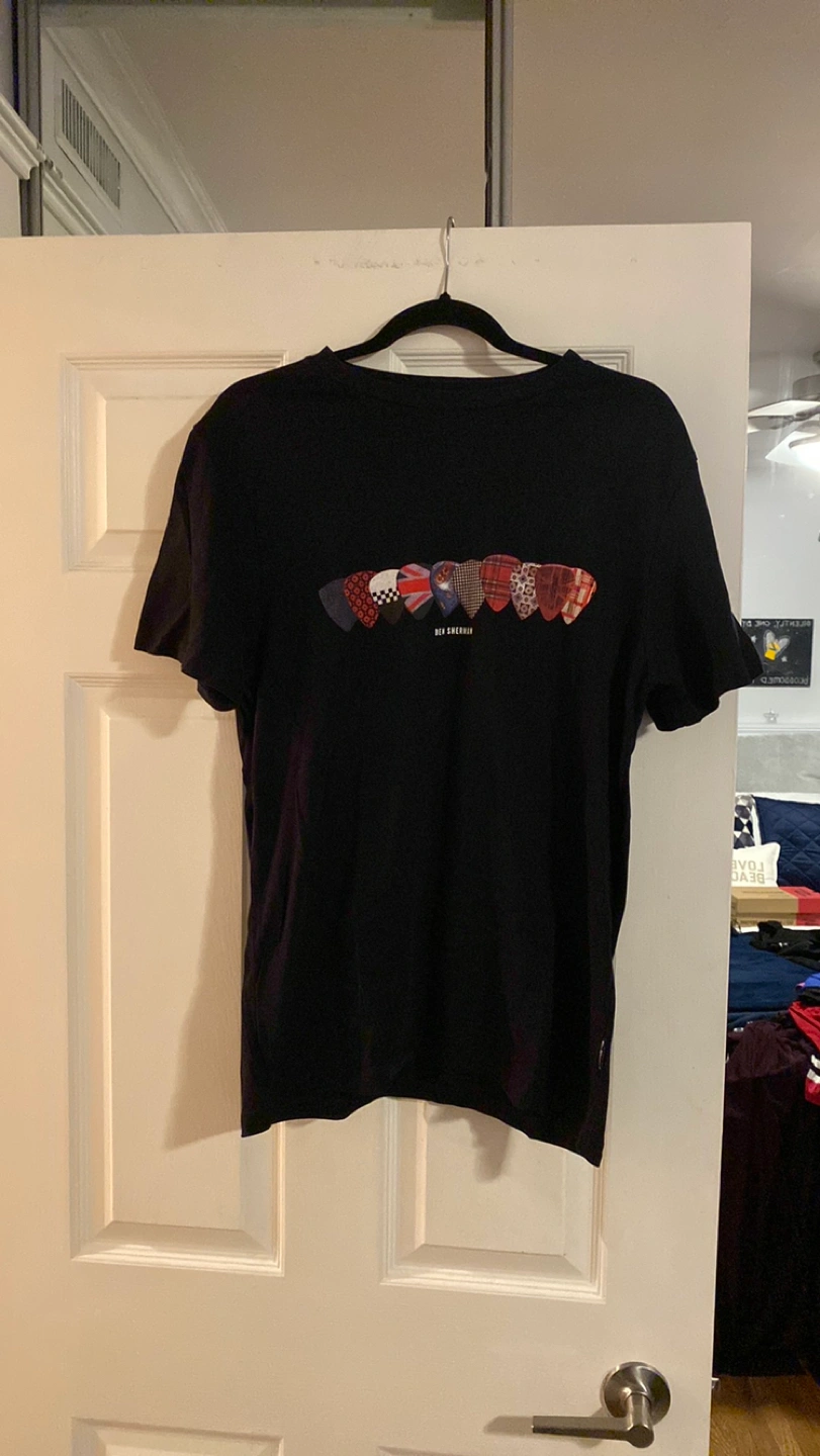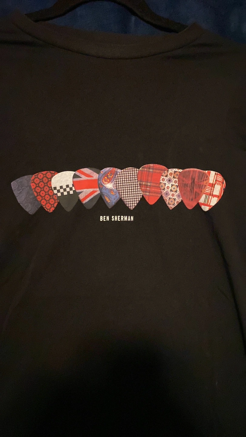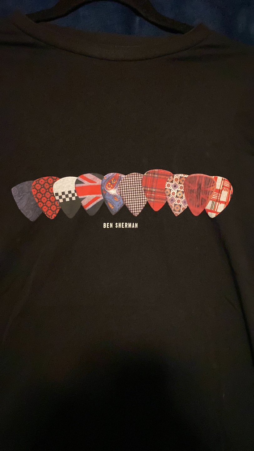 Great Ben Sherman T-Shirt. Black shirt with guitar pics with various countries flags. Very cool. Excellent condition. Washable. Turn inside out to protect decal.