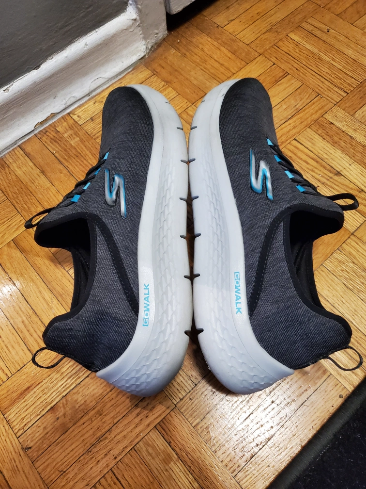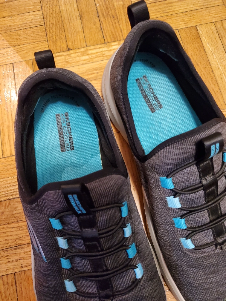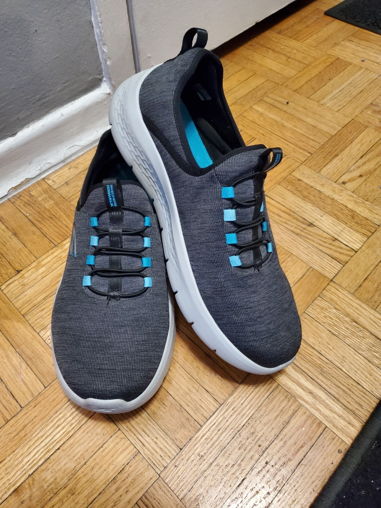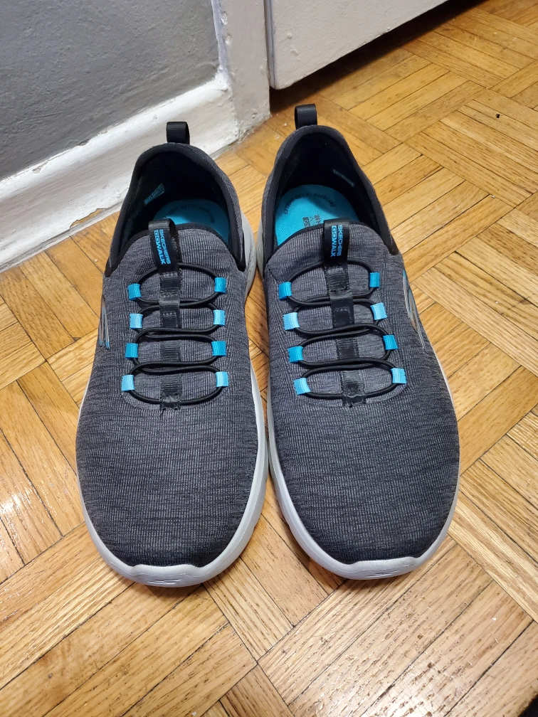 52Grey and blue slip-on sneakers with black laces. Skechers logo on the side. Very good condition only cash price firm no delivery . I have more Shoes for Women's ,Men's, Boys Girls and Kids for sale all size. I have and app Facebook and app Kijjijji. Location Cawthra and Lakeshore Mississauga.