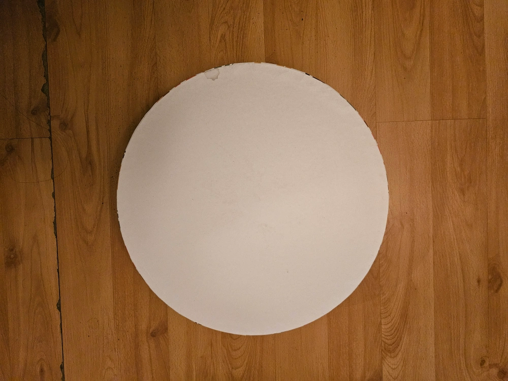 Round cardboard scratching post for cats. Features a colourful pattern on the outer edge.