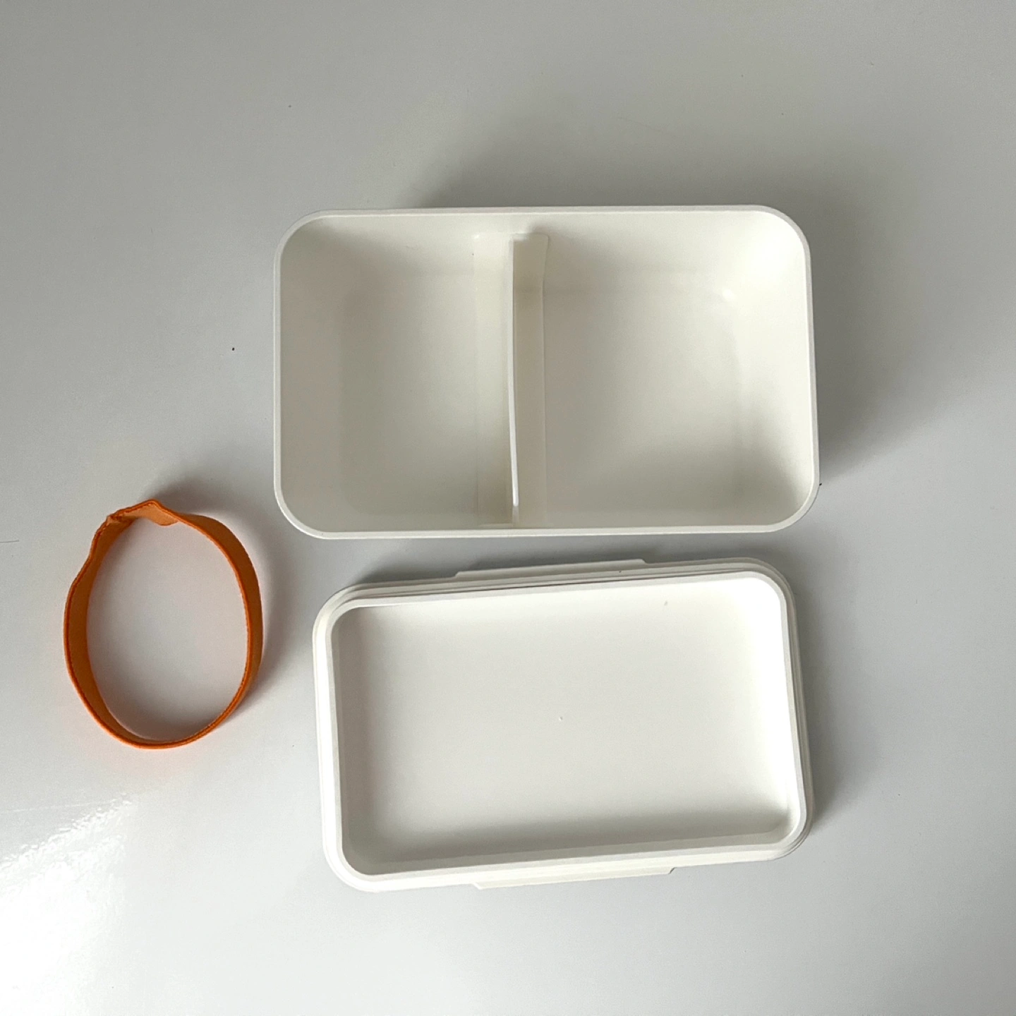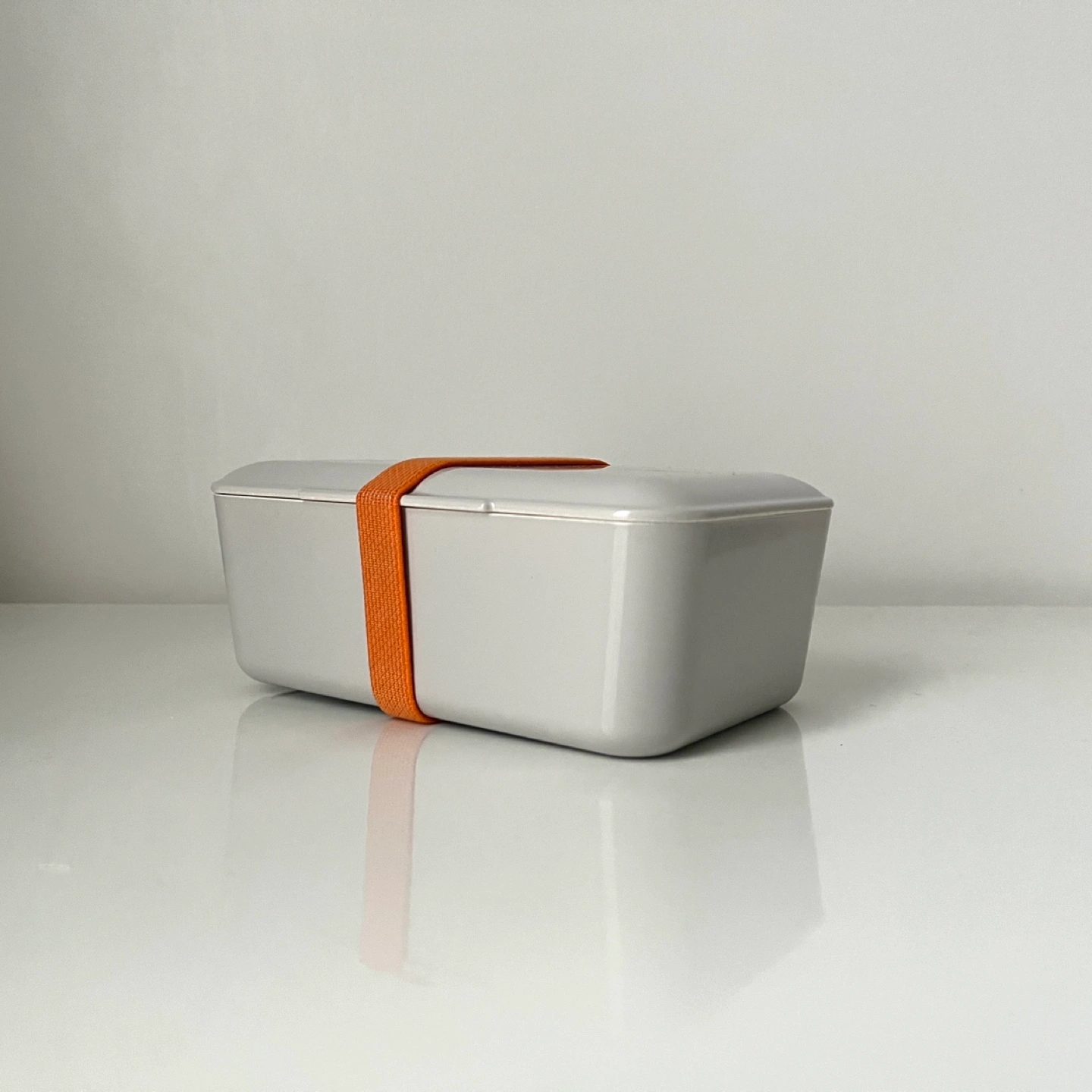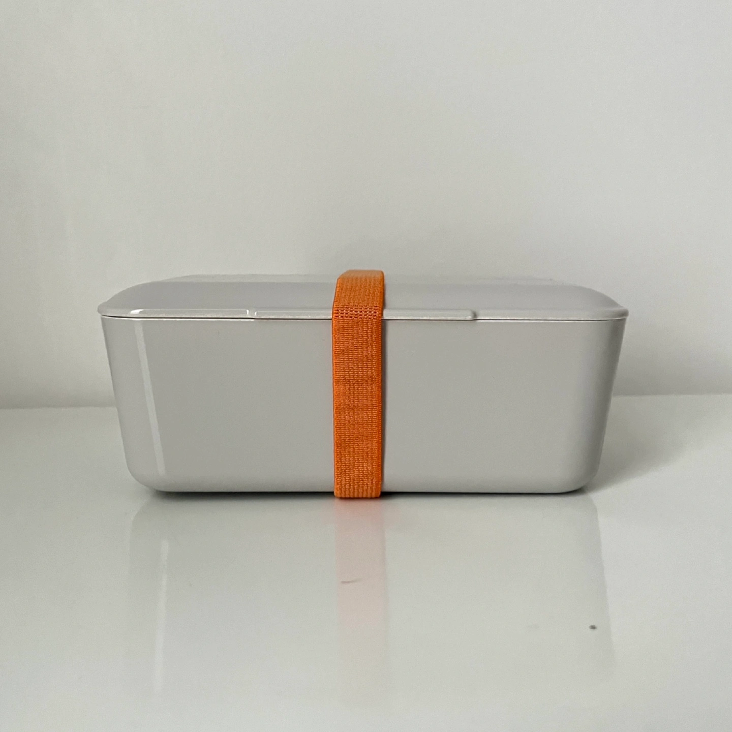 Grey bento box with an orange elastic band. Includes a movable divider.