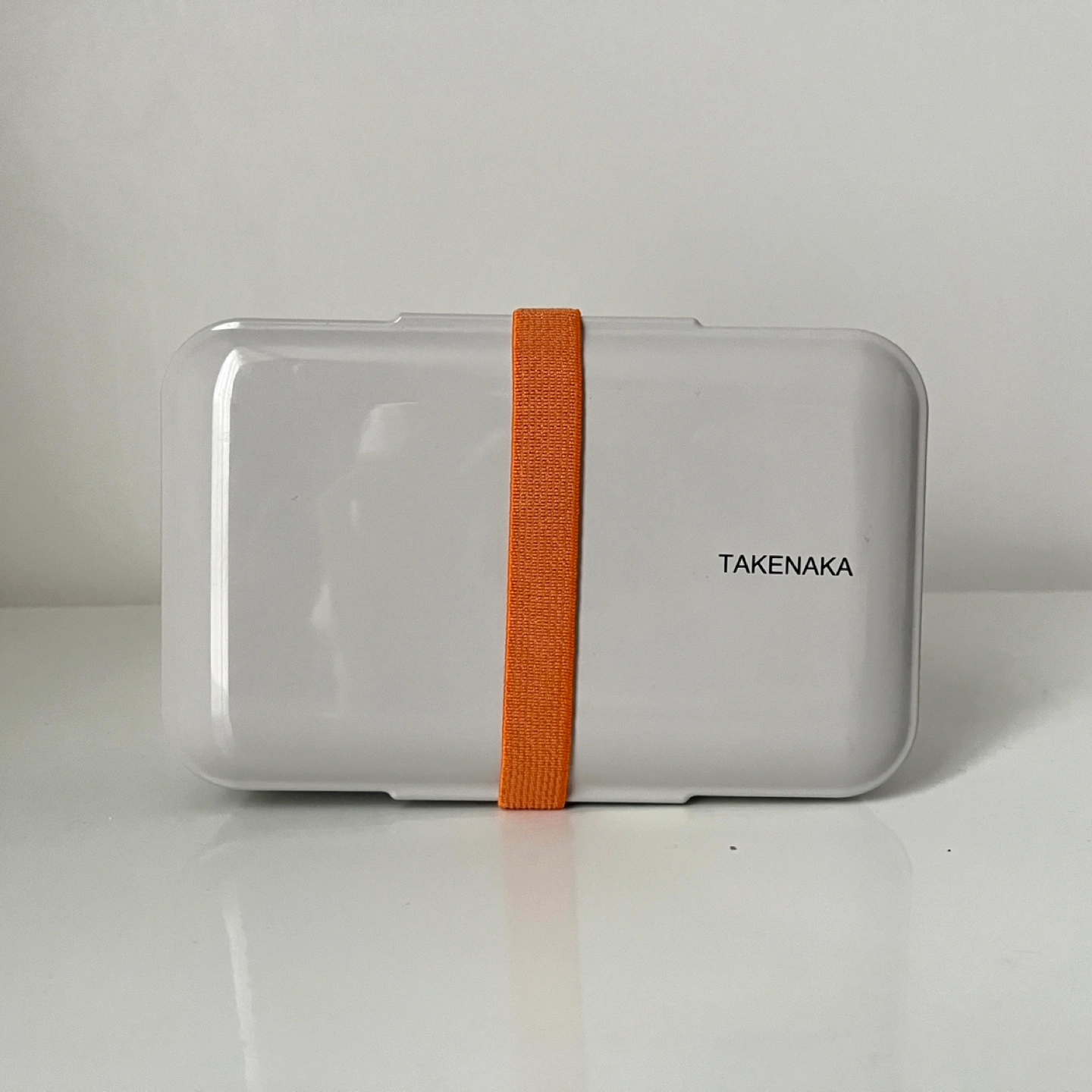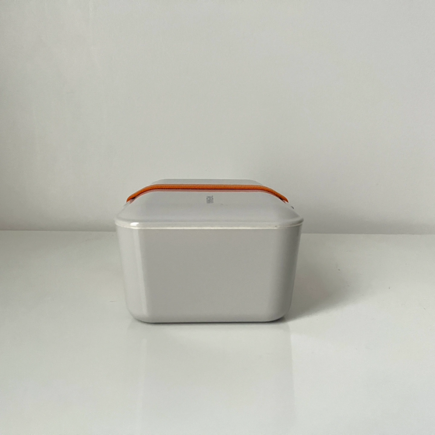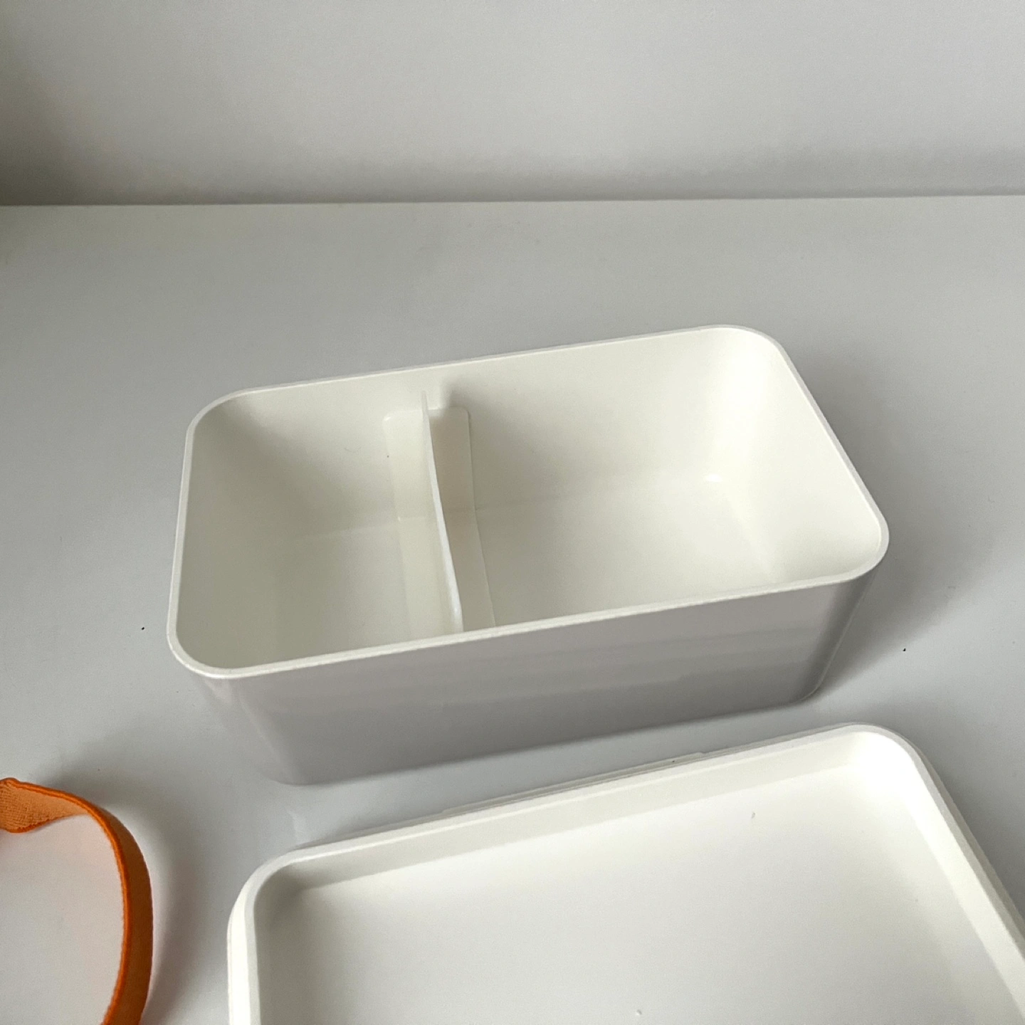 Grey bento box with an orange elastic band. Includes a movable divider.