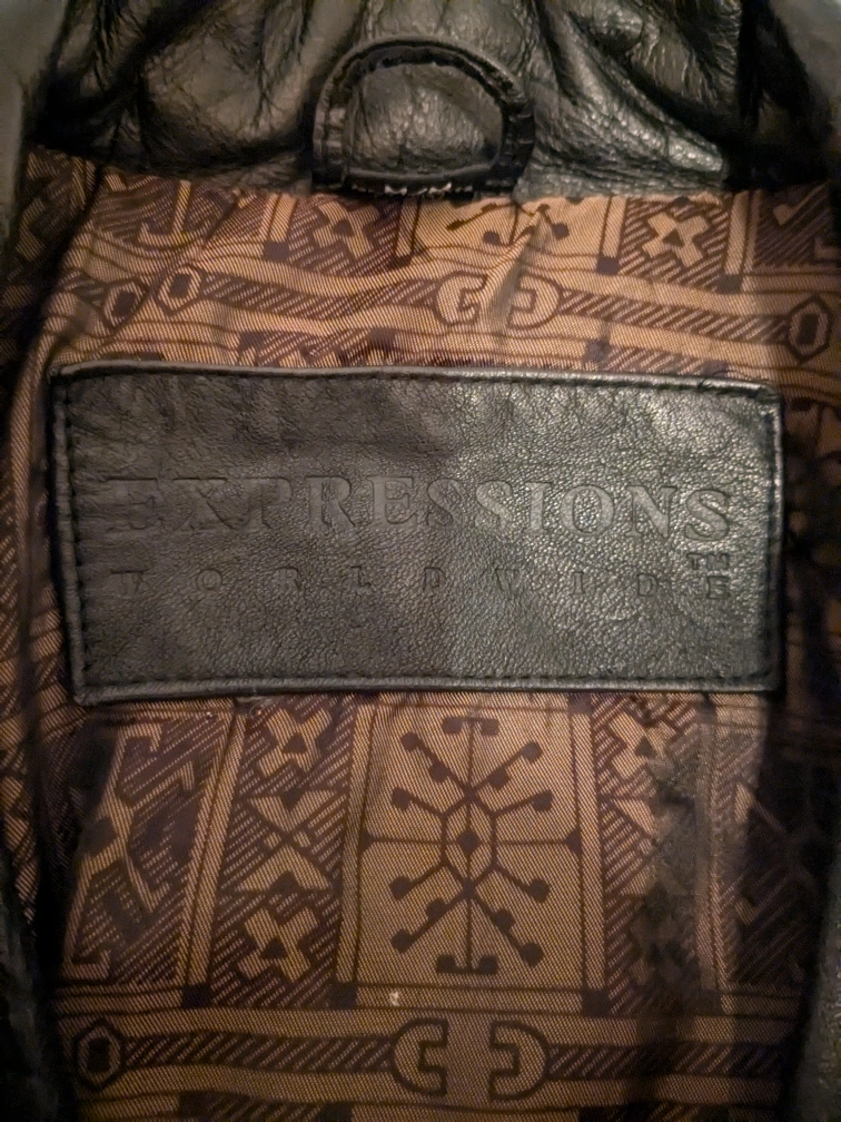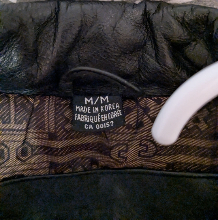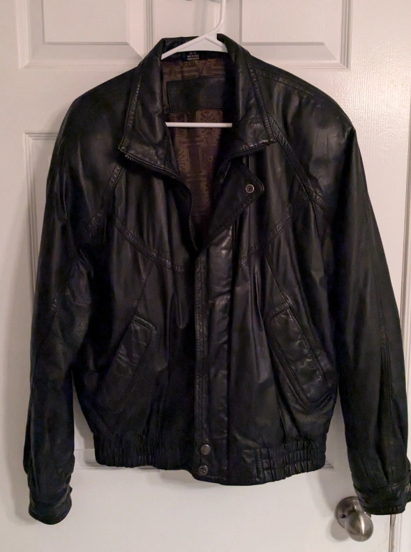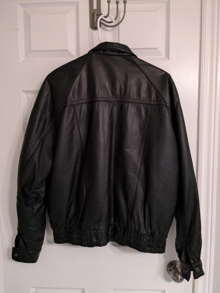 Black leather jacket with a zipper closure, two front pockets, and an elastic waistband. The jacket is in good condition with minimal signs of wear.