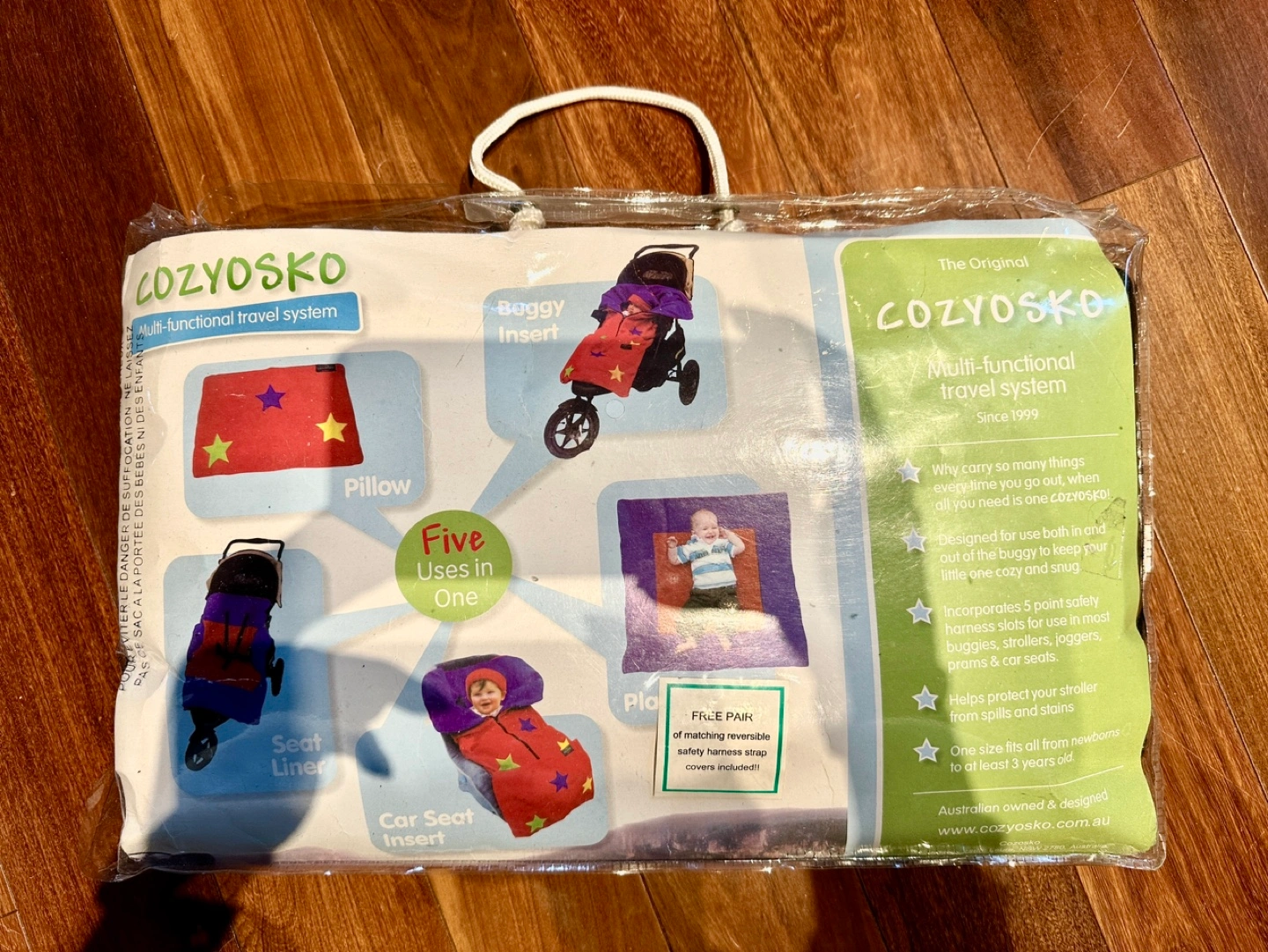Multi-functional travel system. Five uses in one: Buggy Insert, Car Seat Insert, Seat Liner, Play Rug, Blanket-Pillow. Australian owned & designed.