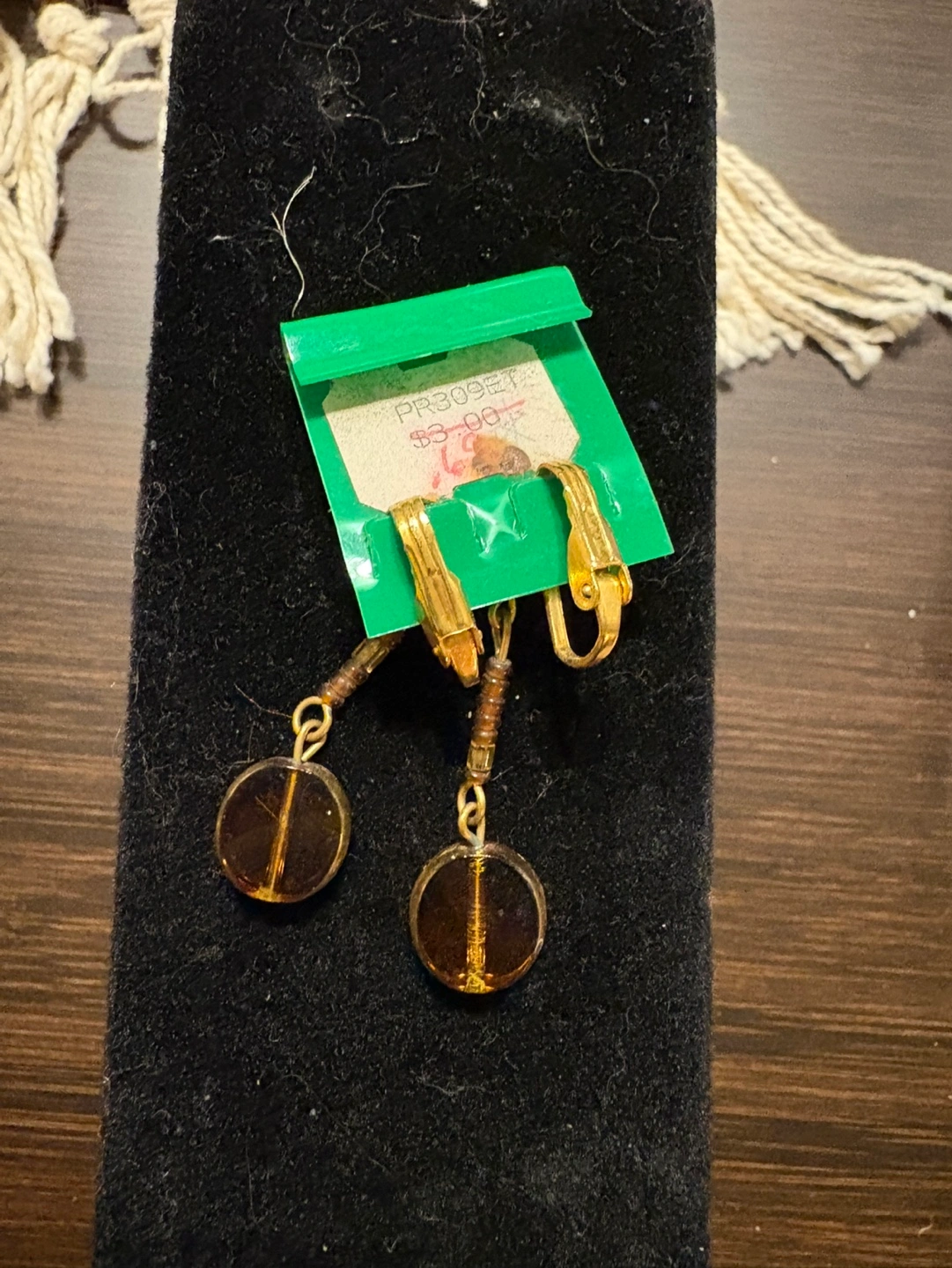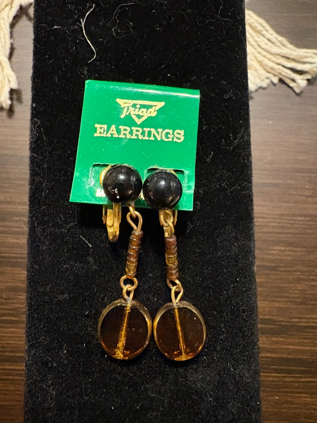 Vintage clip-on earrings with gold tone accents. They have brown glass round stones and black beads. The earrings appear to be unused, but they may show signs of age.
