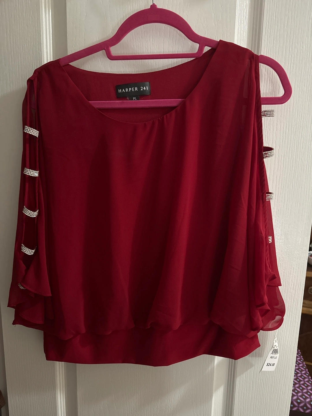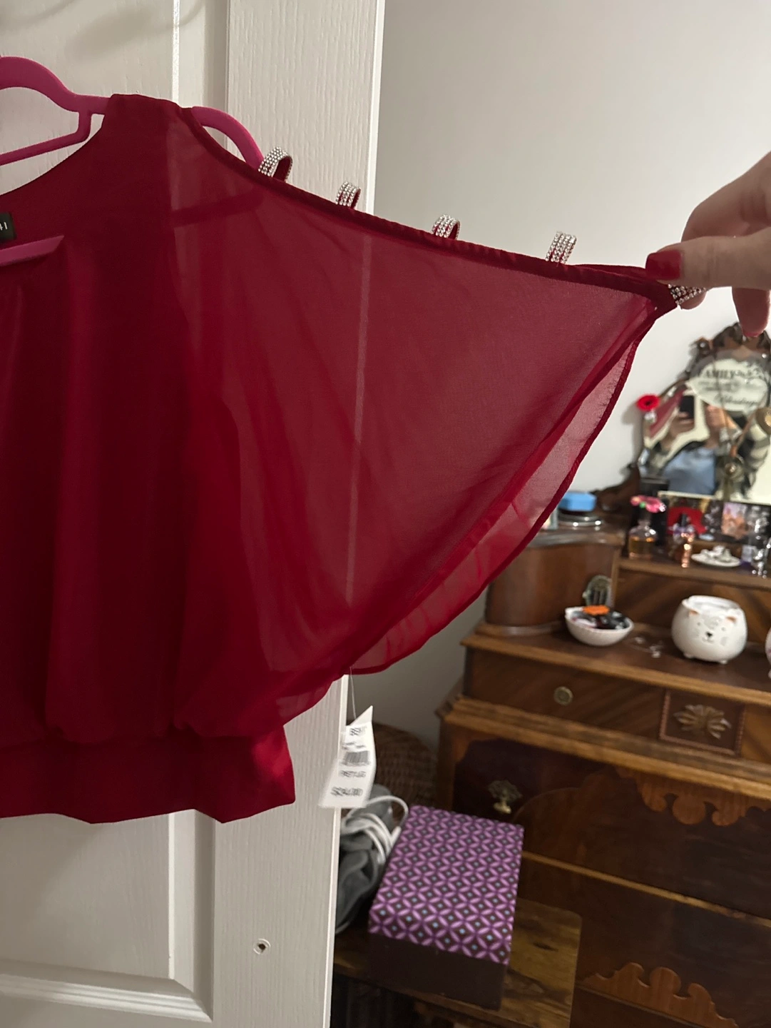 Red chiffon top with rhinestone detail on the sleeves. Sleeves with a loose fit. Looks great with jeans or a skirt.