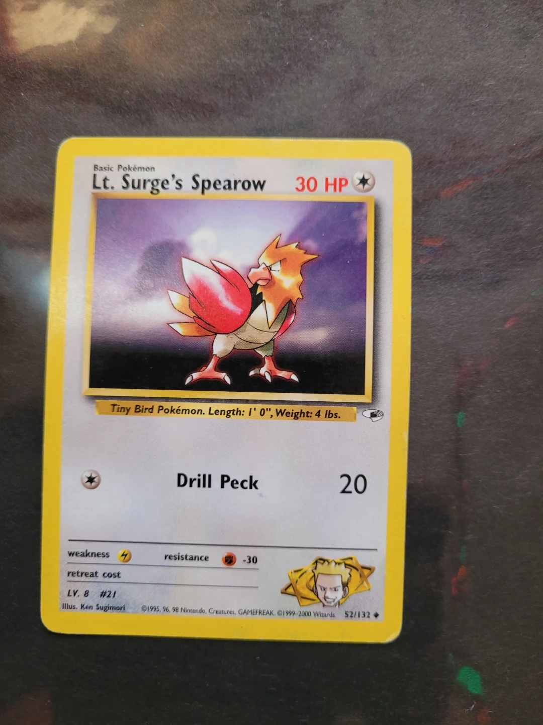 This is a Lt. Surge's Spearow Pokemon card. It's a "Tiny Bird Pokémon" and it's Level 8. The card features the "Drill Peck" attack.