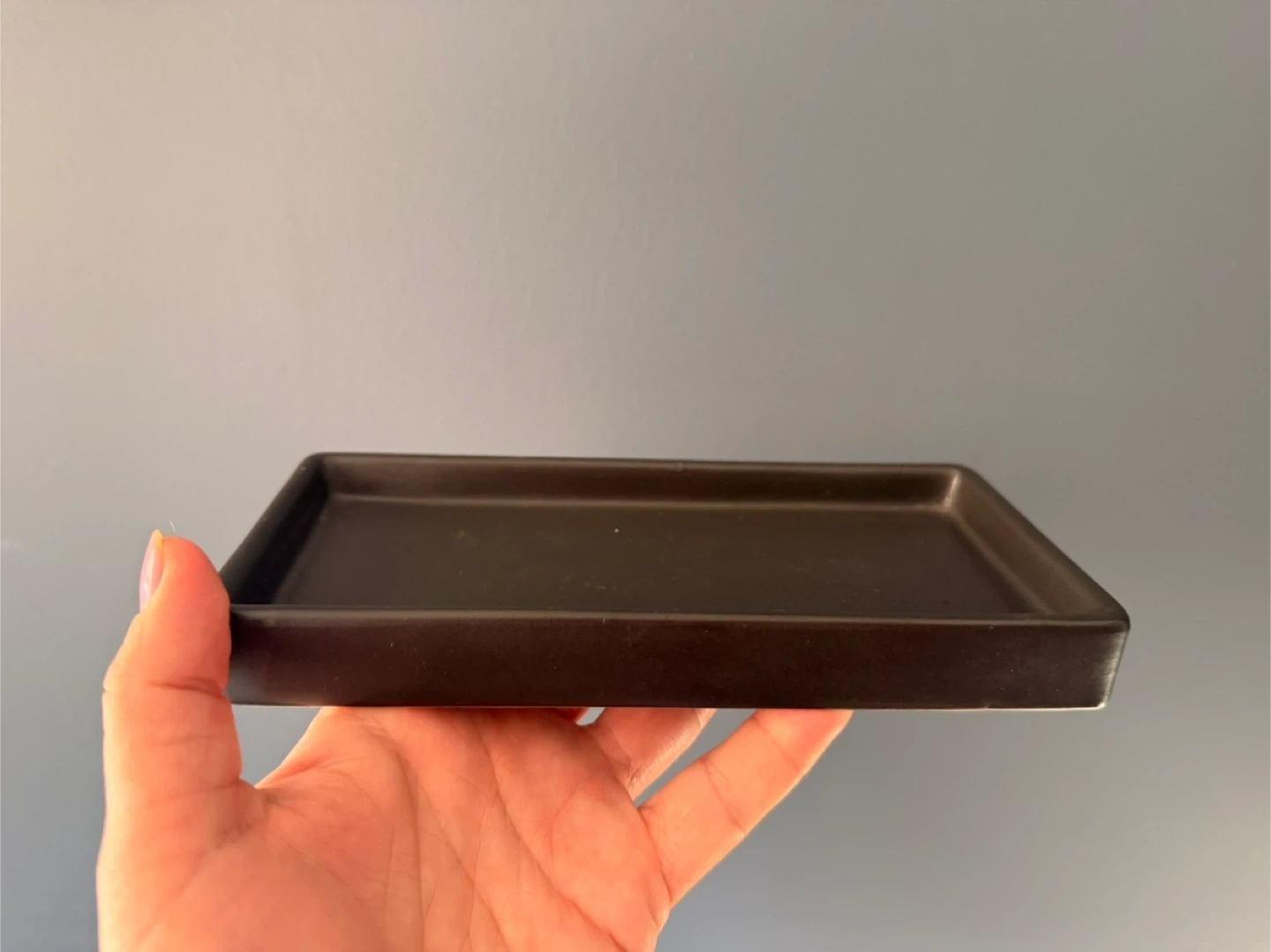A simple rectangular tray with a matte black finish. Its shallow depth makes it great for corralling small items. Use it for keys, change, or as a small dish for trinkets.