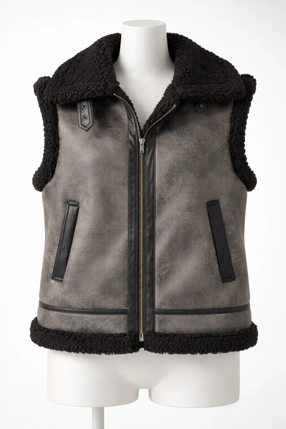 Grey leather vest with black sherpa lining and trim. Features a full zip front and two side pockets. Great for layering on cooler days!