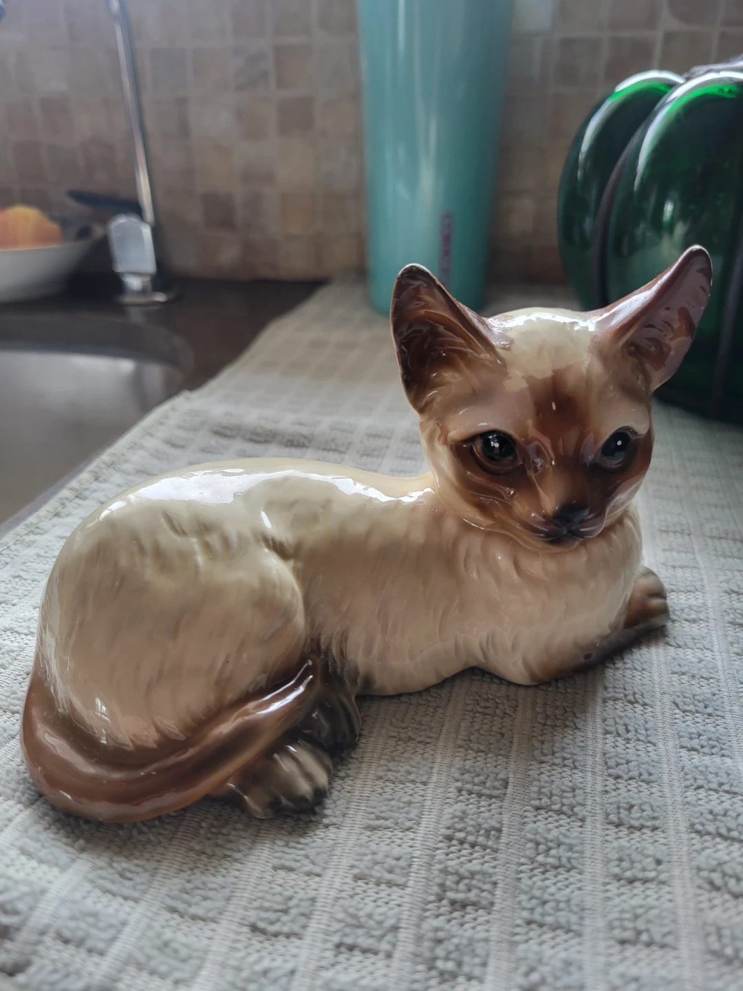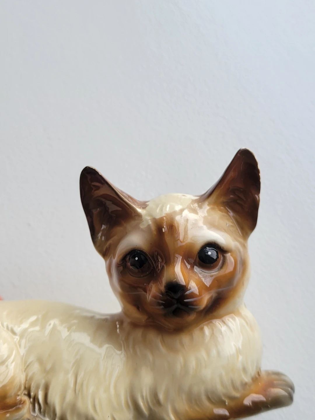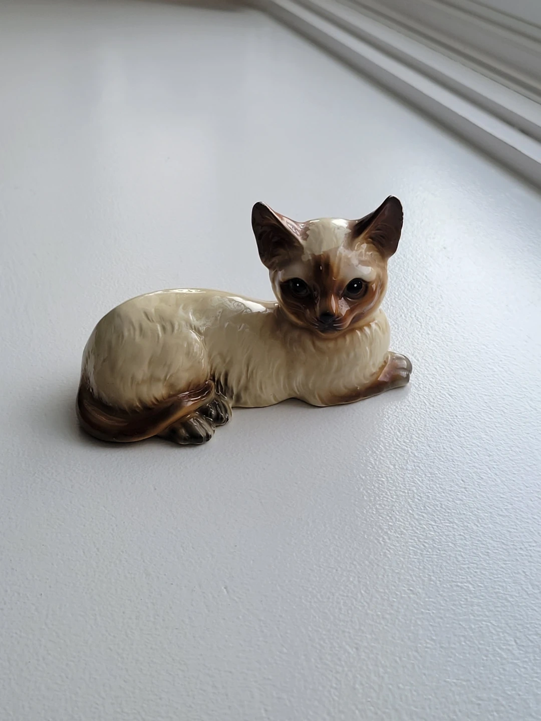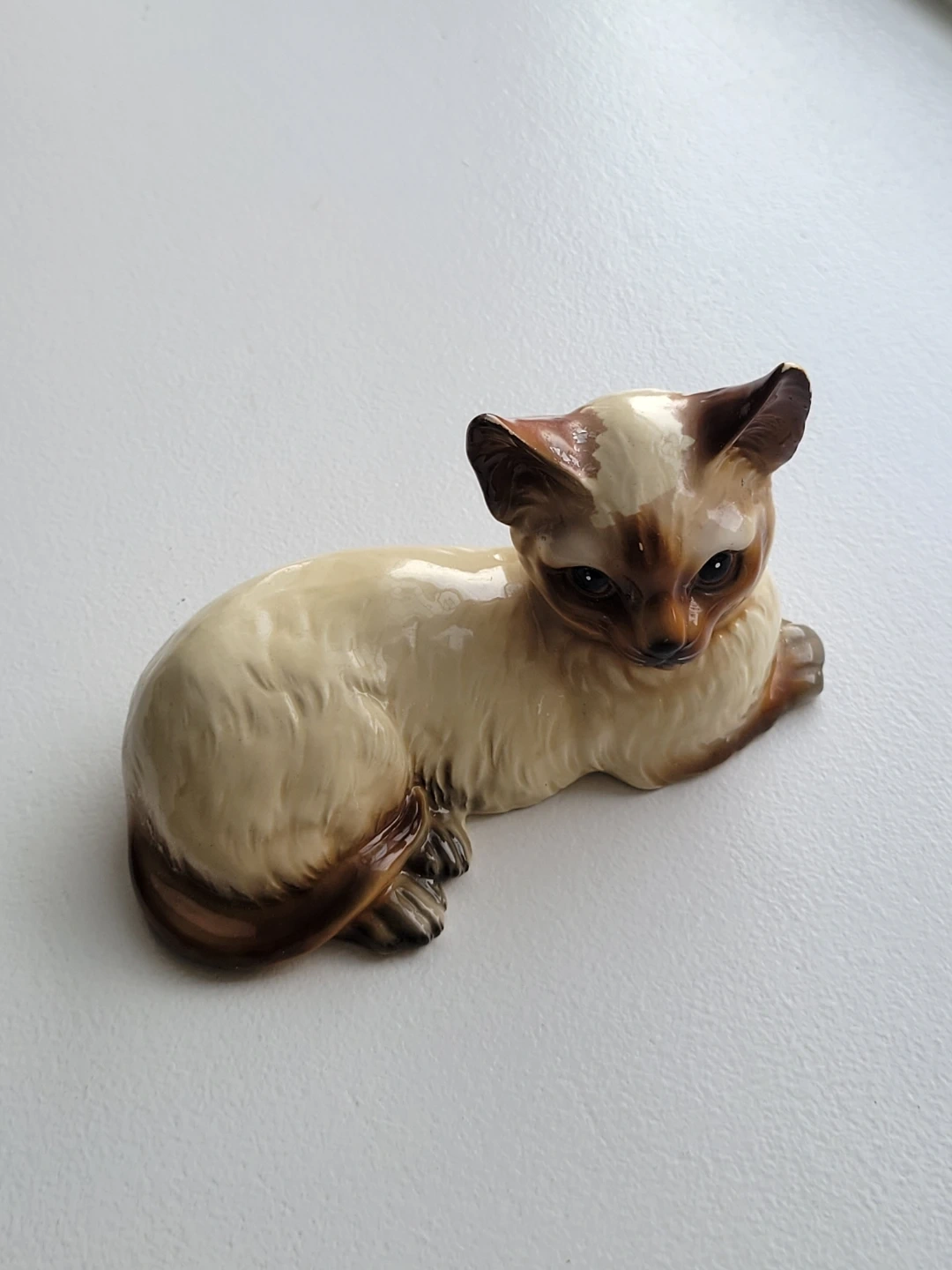 Vintage Siamese cat figurine, perfect for collectors or cat lovers! It has a charming, lifelike pose and beautiful detailing.