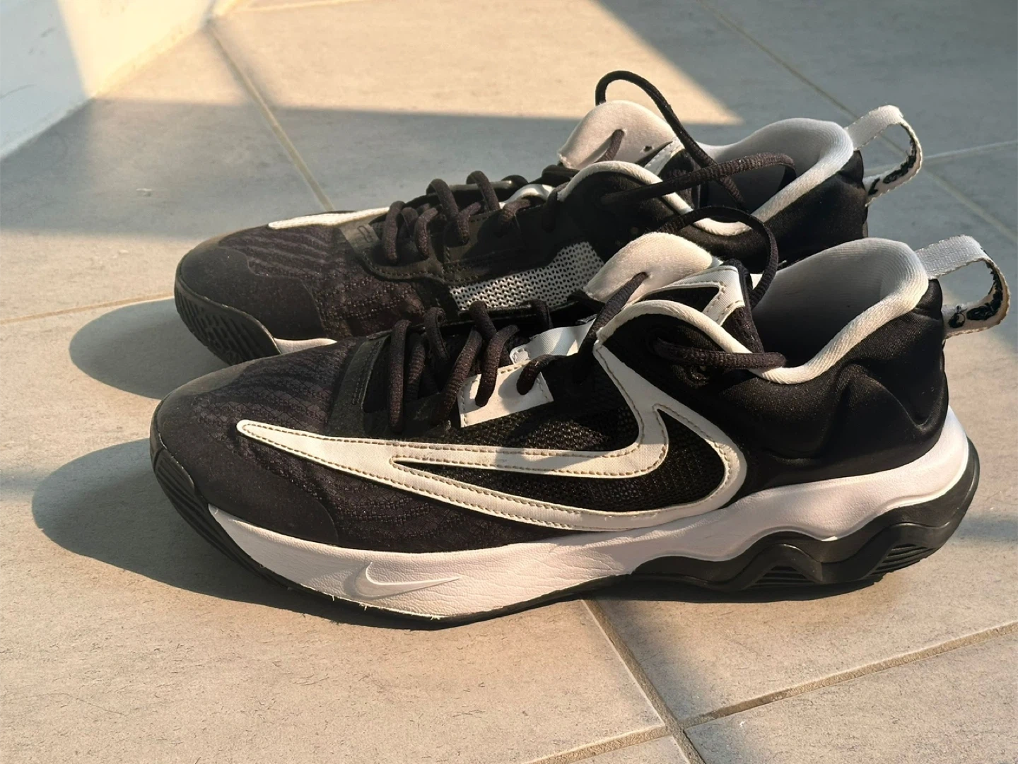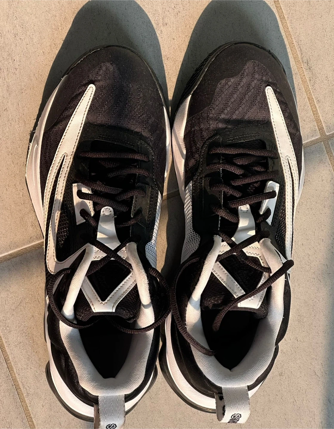Black and white Nike basketball shoes. Lace-up closure. These shoes are built for performance on the court. They're designed for grip and support.