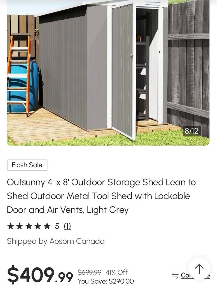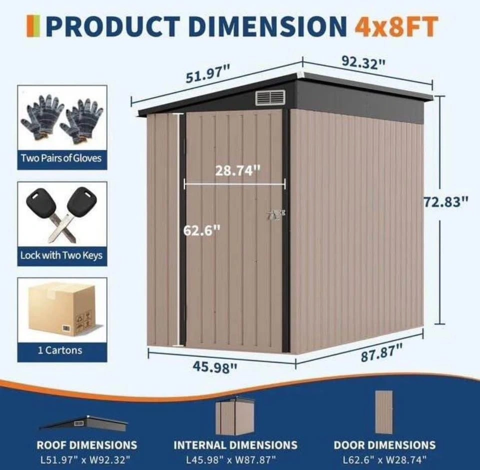 Brand new, factory-sealed 4x8 ft metal storage shed (ES46628). Made from heavy-duty galvanized steel, it's corrosion-resistant and wind-rated up to 70 mph. Features front & rear air vents, secure lockable double doors, and a space-saving lean-to design with a sloped roof for fast water drainage. Perfect for bikes, lawn equipment, tools, pet shelter, or garbage storage. Color: Brown | Weight: 108 lbs. Pickup: Hurontario & Sandalwood.