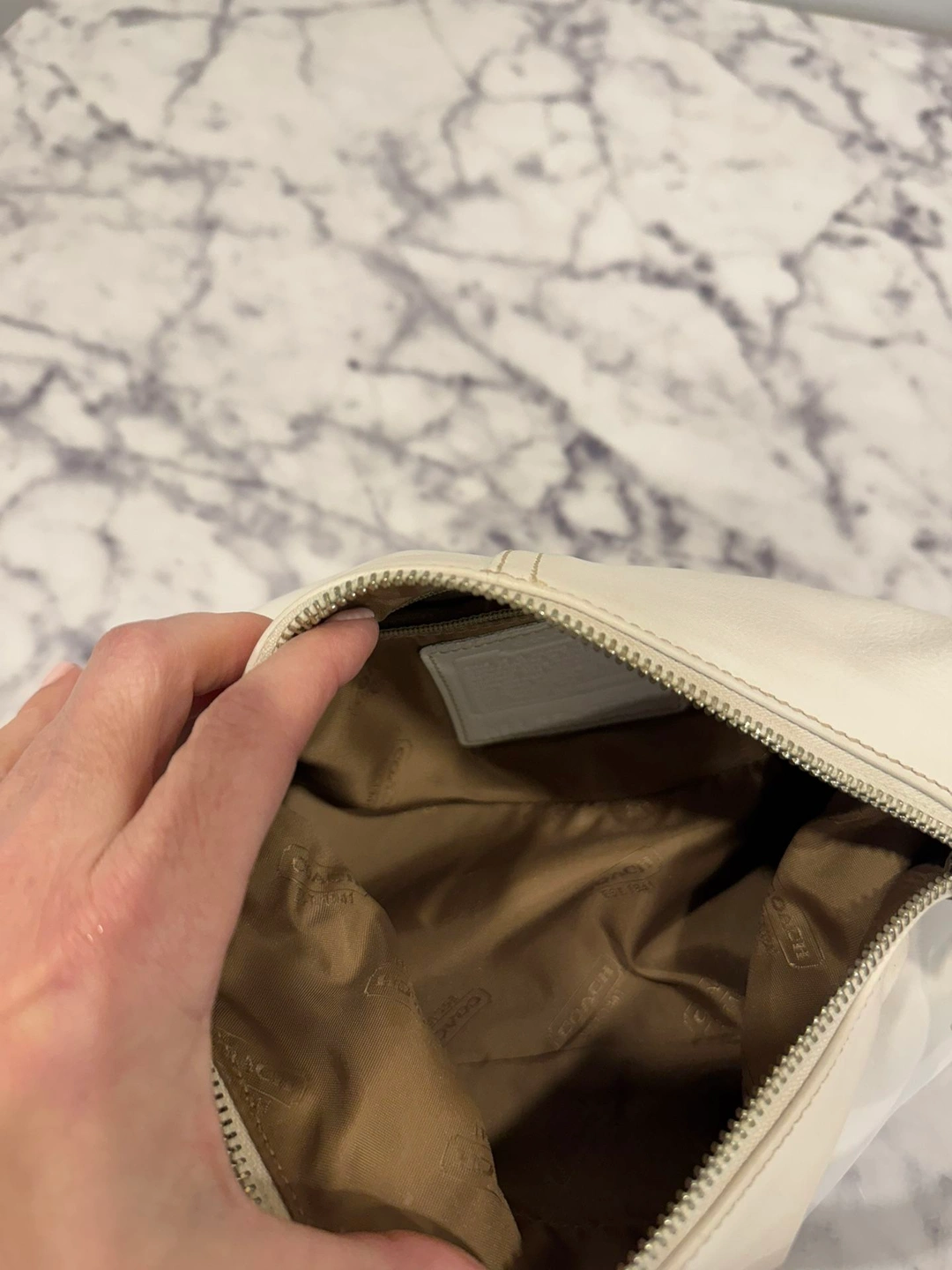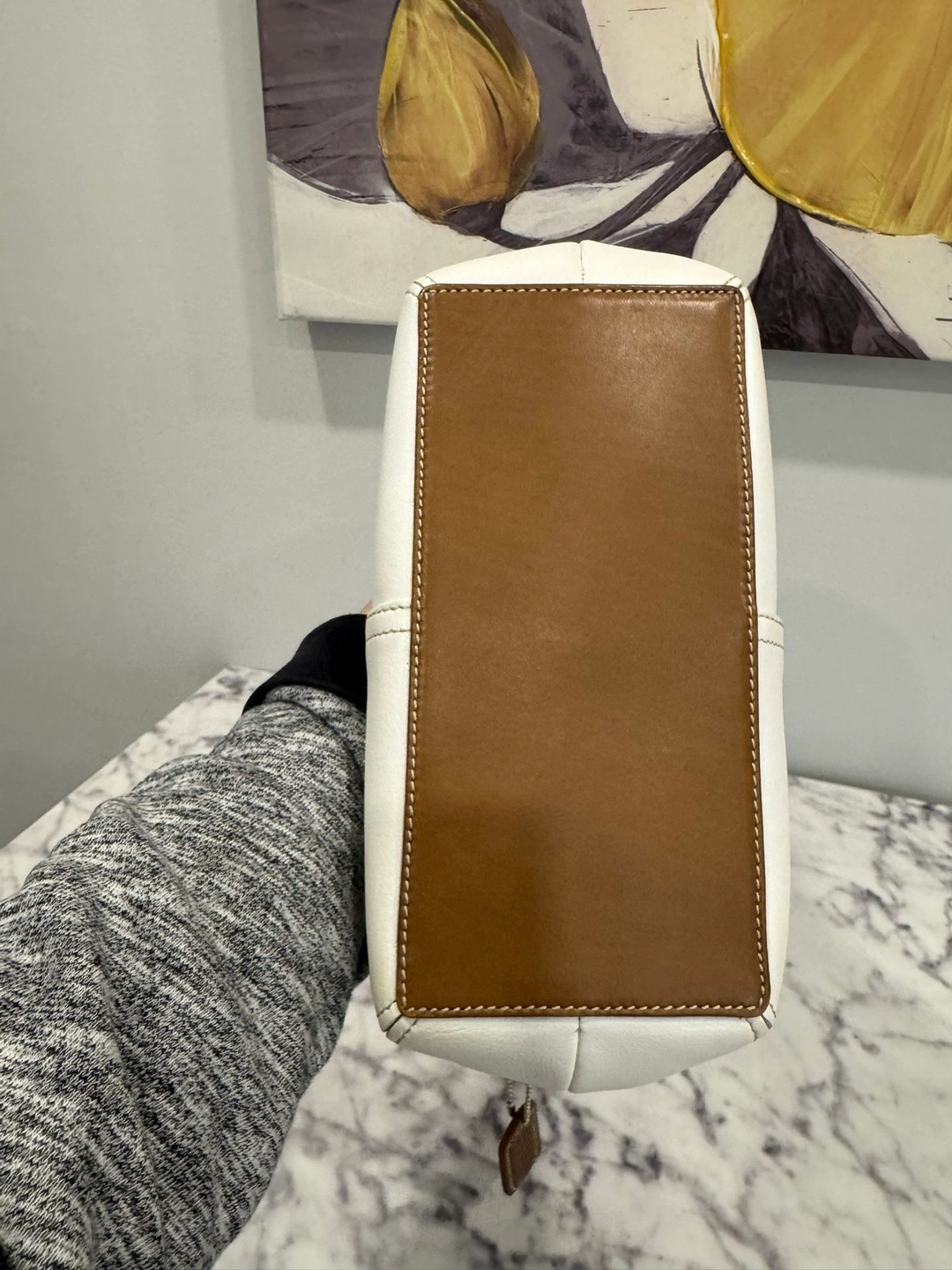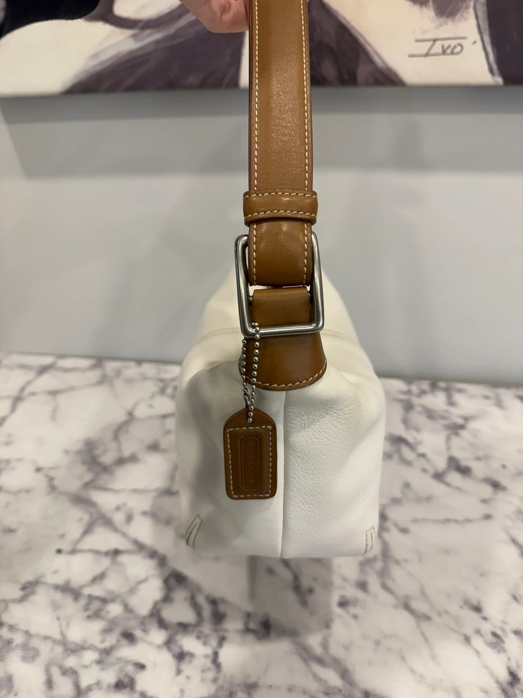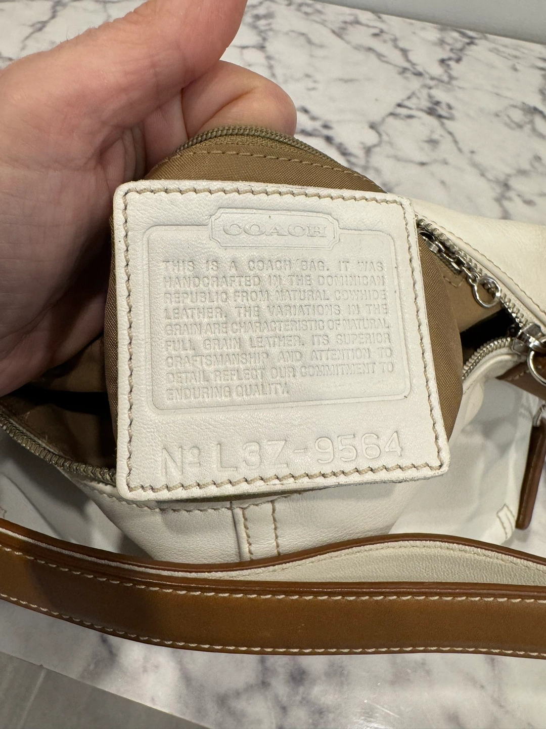 Coach Legacy Demi Hobo bag, style 9564. Crafted in white leather with a classic tan strap. Sleek, minimalist design with top zip closure and spacious interior. Produced around 2003. Excellent vintage condition.