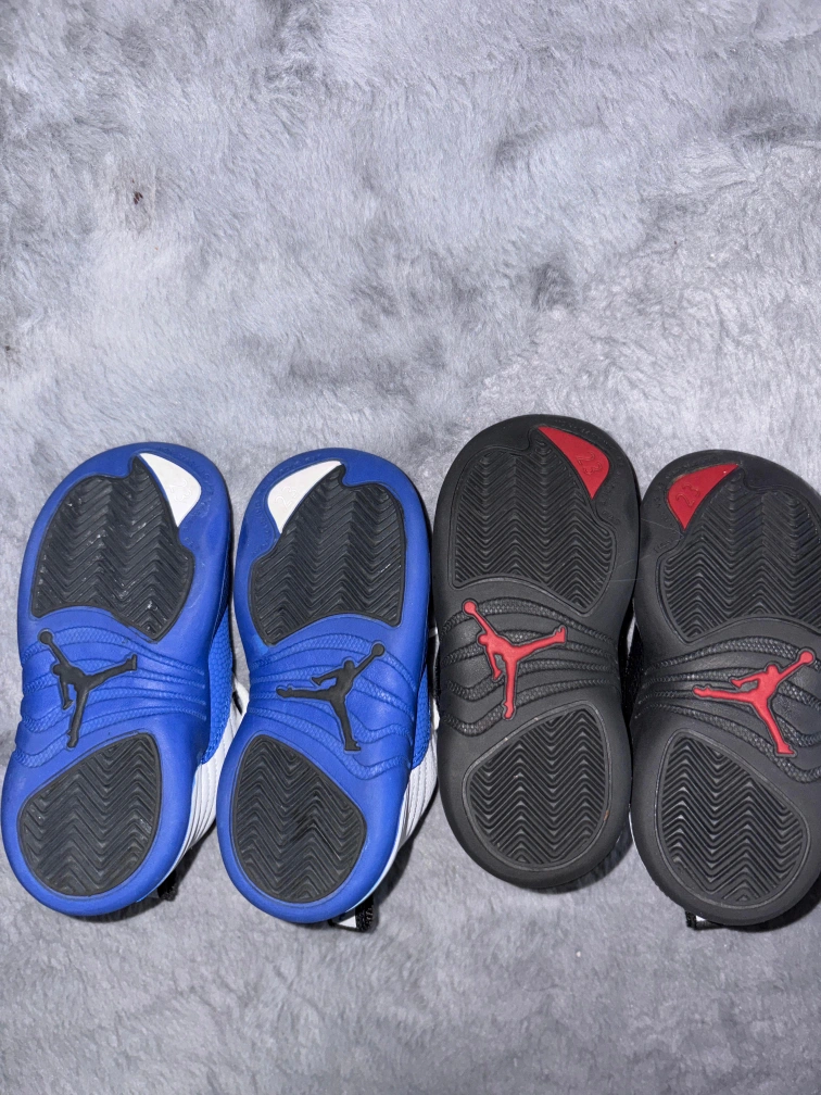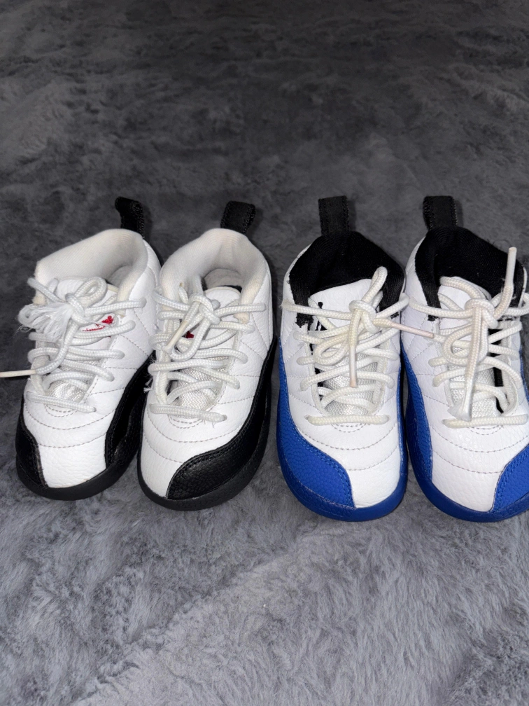 Two pairs of toddler Air Jordan 12 Retro shoes. One pair is in a royal blue and white colorway, and the other is in black and white. These iconic sneakers feature the classic '23' on the heel.