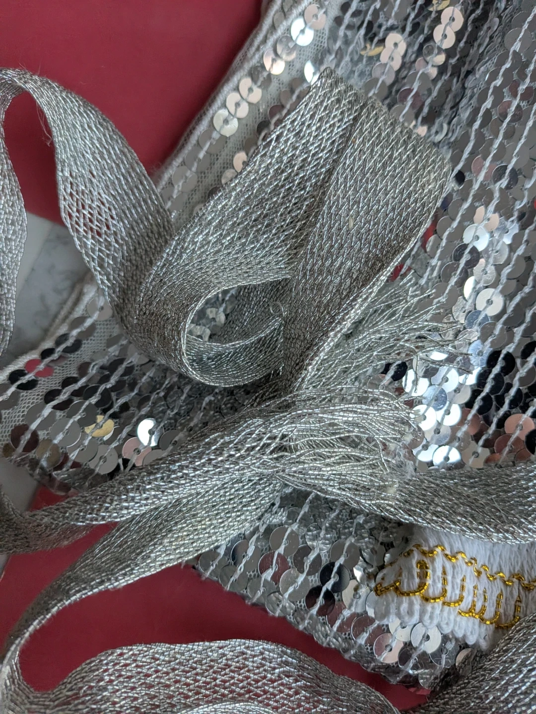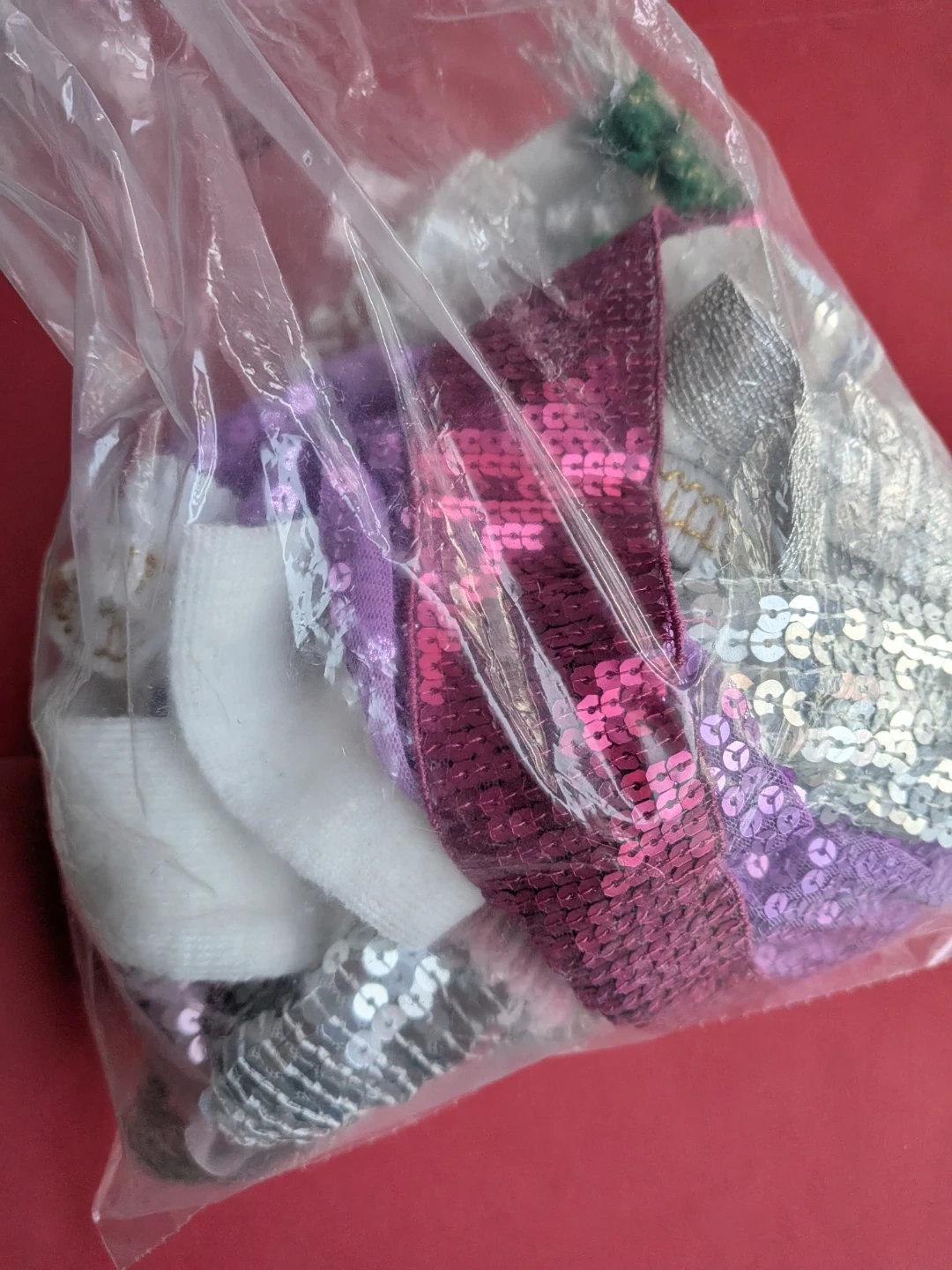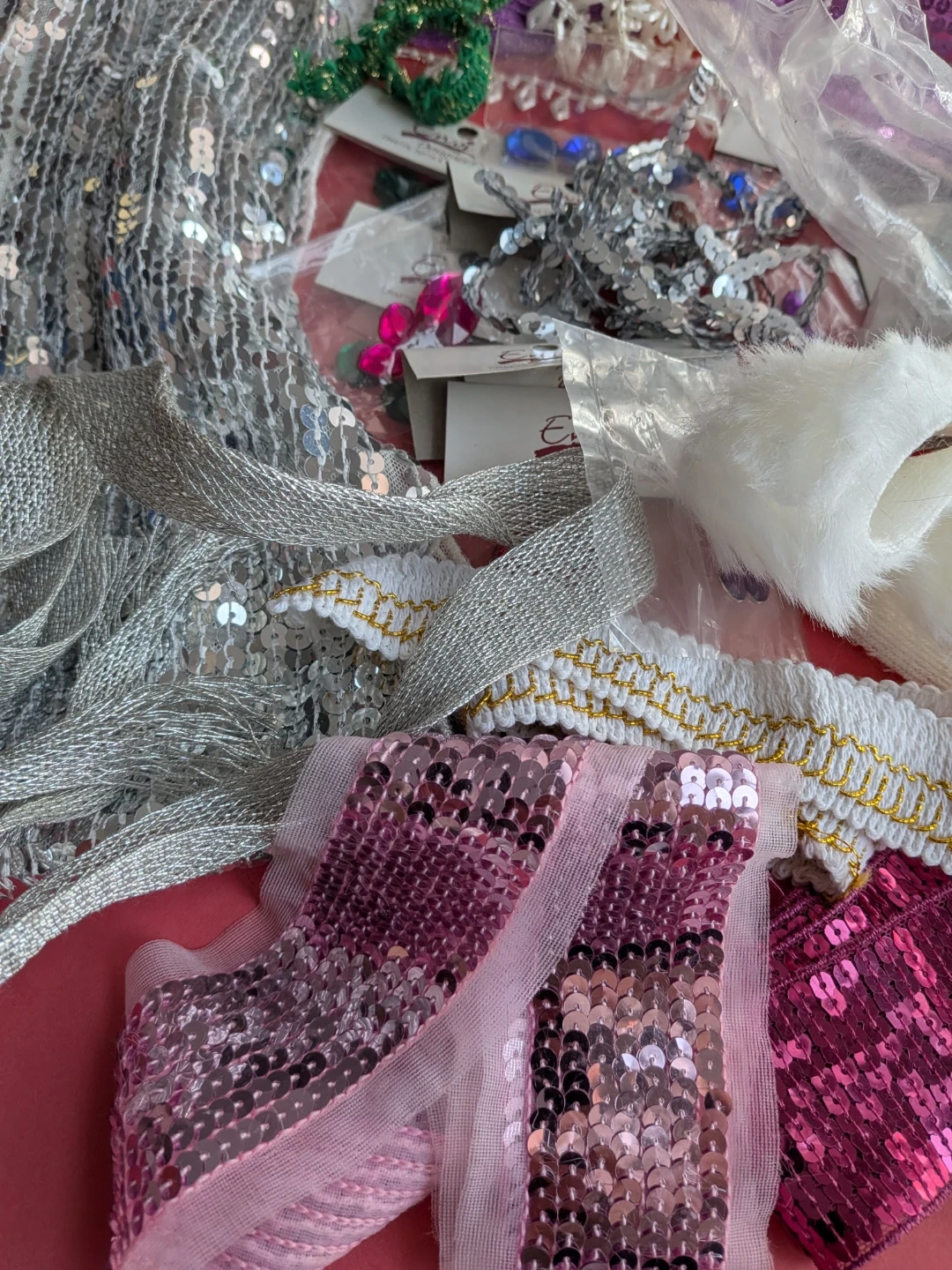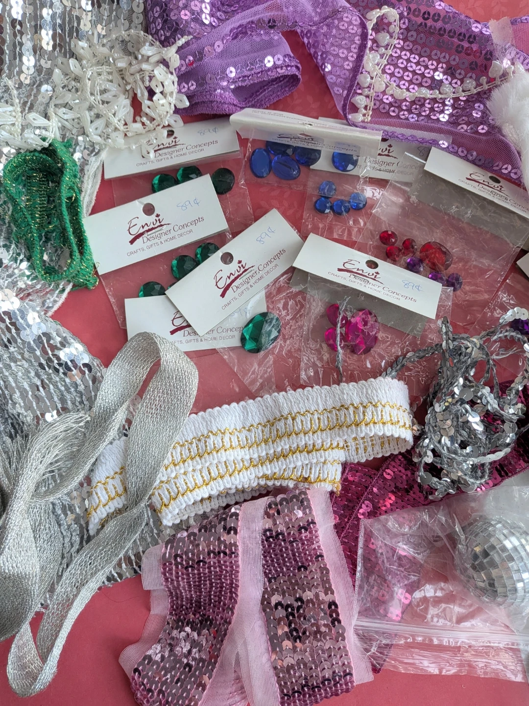 A collection of craft embellishments including sequins, beads, rhinestones, and trims. Perfect for DIY projects and garment decoration!