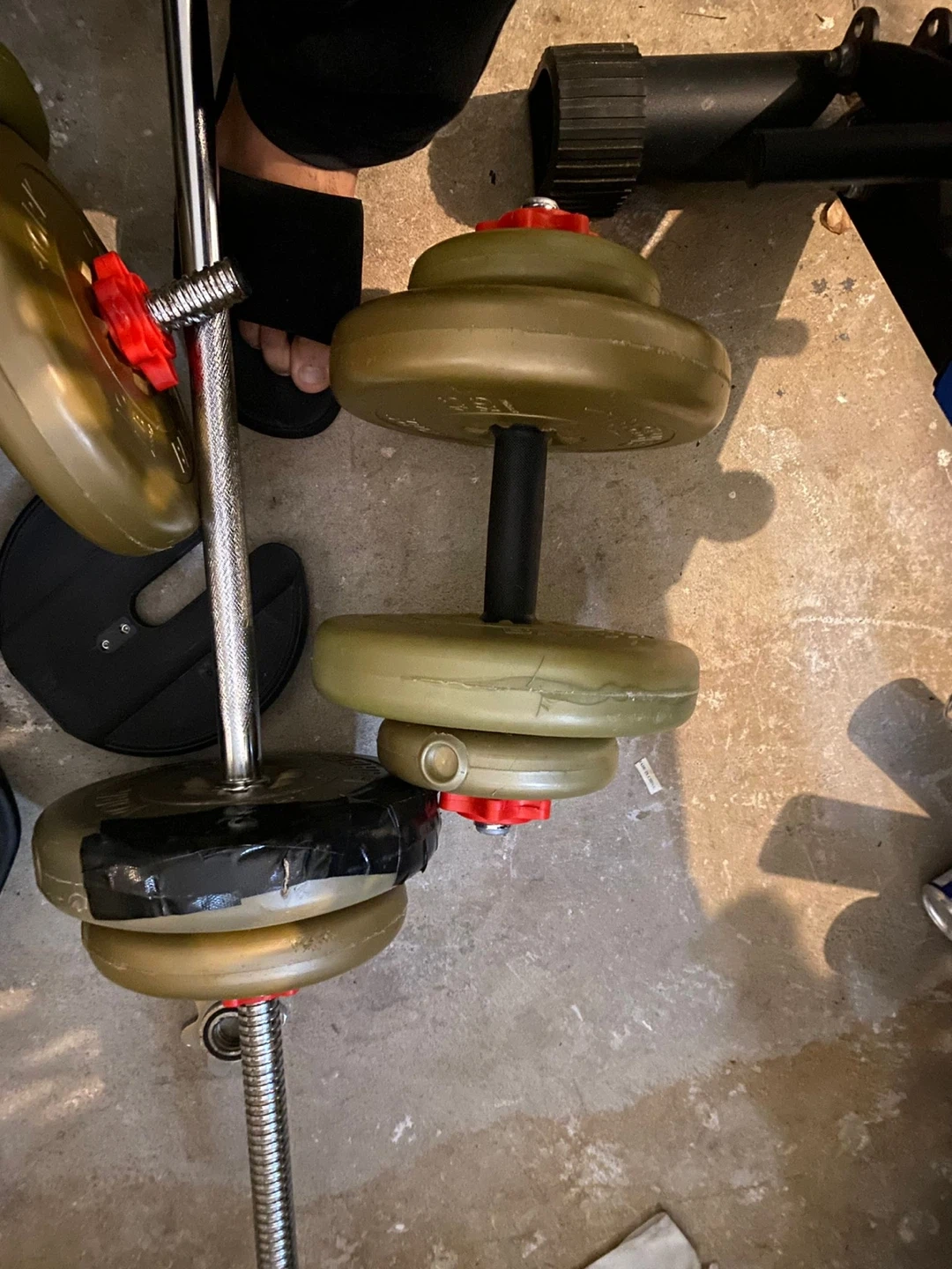 This is a York Barbell weight set that includes a curl bar and various weight plates. It's great for home workouts and building strength. The set comes with several dumbbell bars and weight plates too. Clearing up garage price negotiable