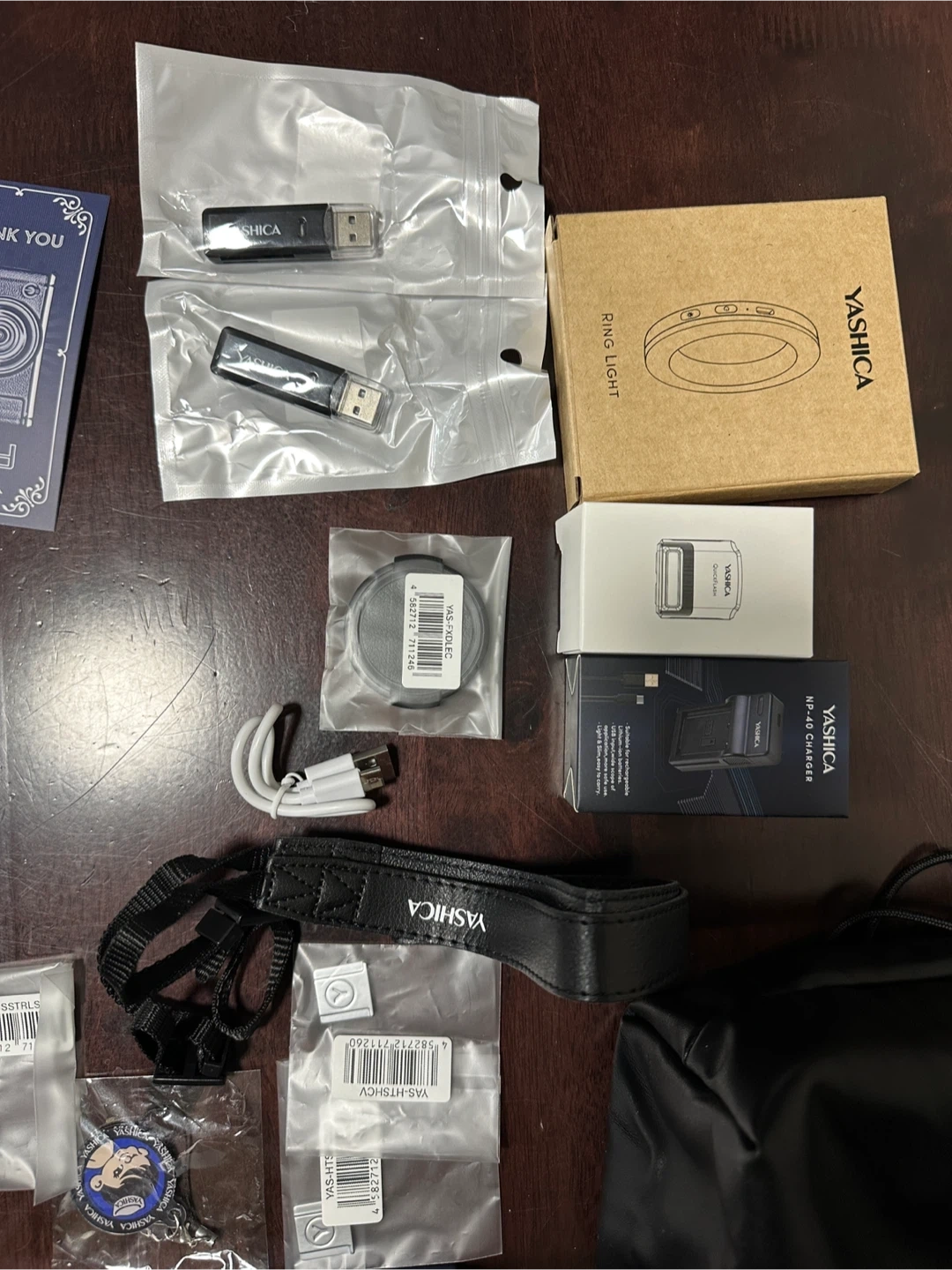 Brand New Yashica FX-D S300 digital simulation camera, it comes with a lot of accessories. Included is a ring light, a USB charger, and two USB drives. It also has a strap and a carrying bag.