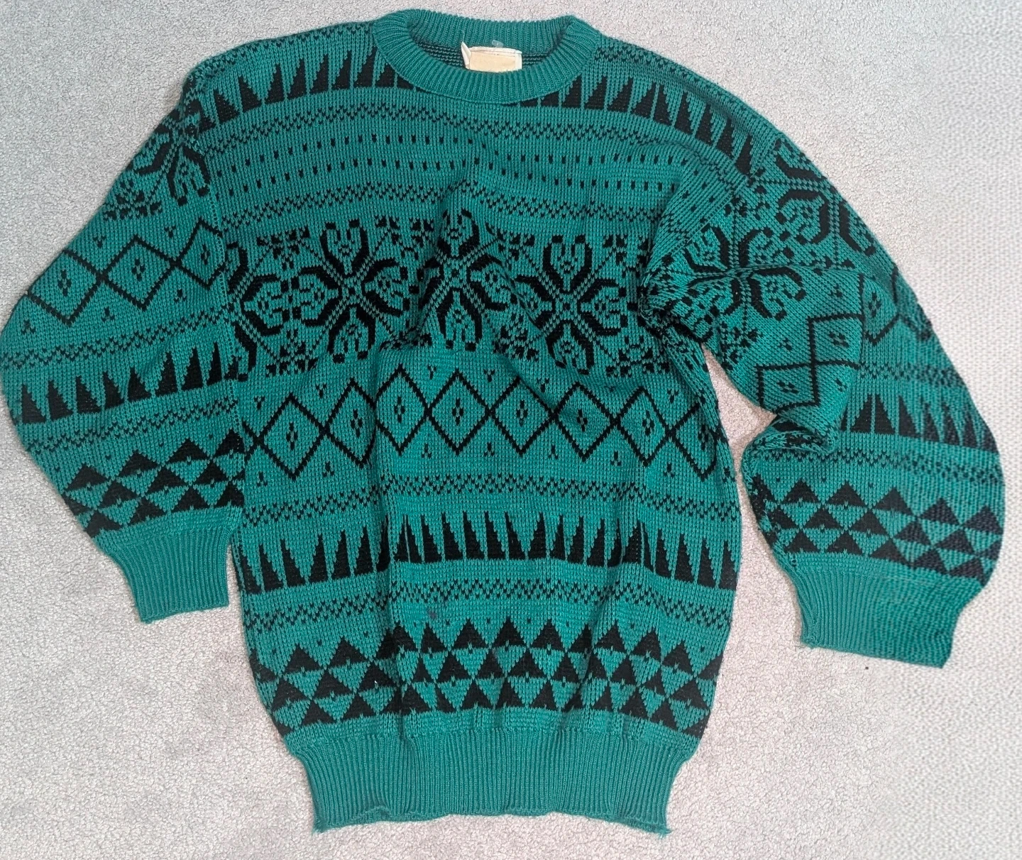 Cozy knit sweater featuring a classic crewneck style with a bold teal and black geometric pattern. It's made from a soft, durable material perfect for cooler weather. This sweater adds a retro flair to any casual outfit!