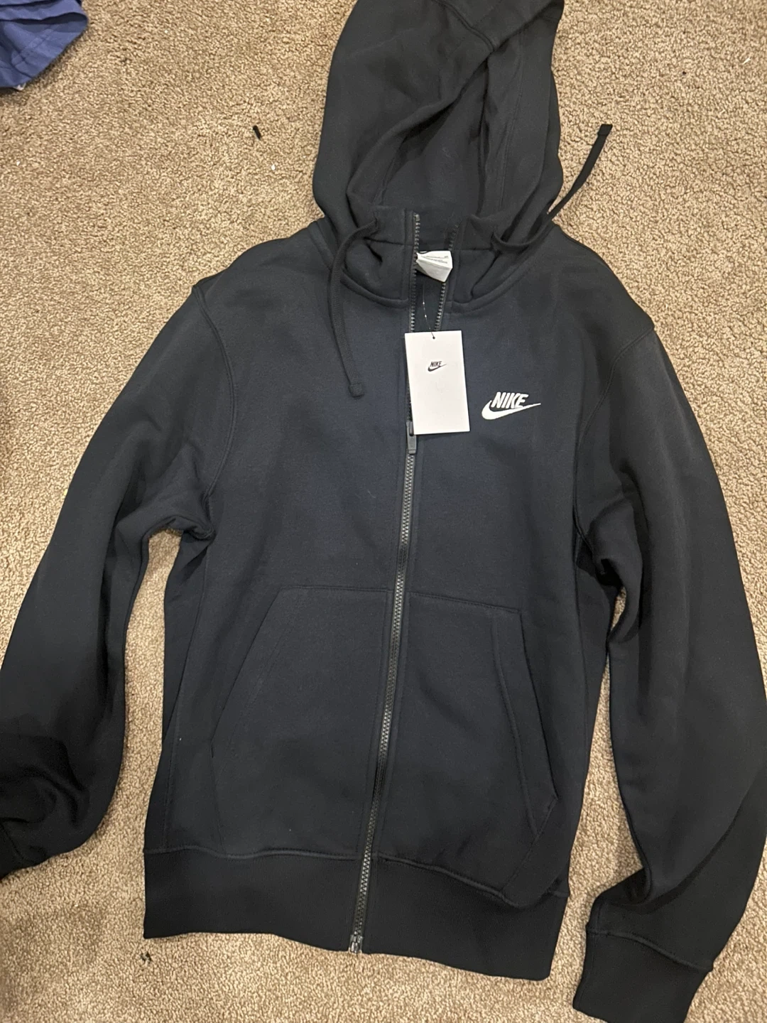 Brand new Black Nike full zip hoodie with a white embroidered logo. It features a drawstring hood and front pockets. This hoodie is made for comfort and casual wear.