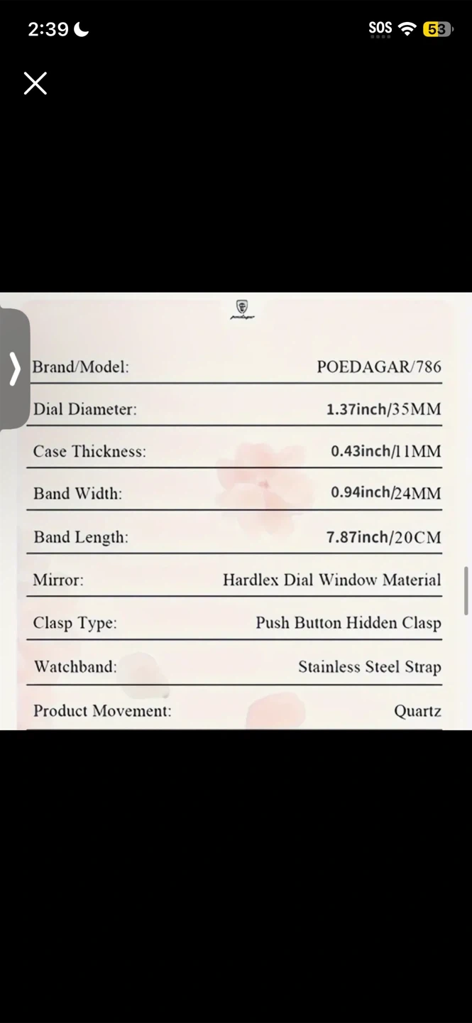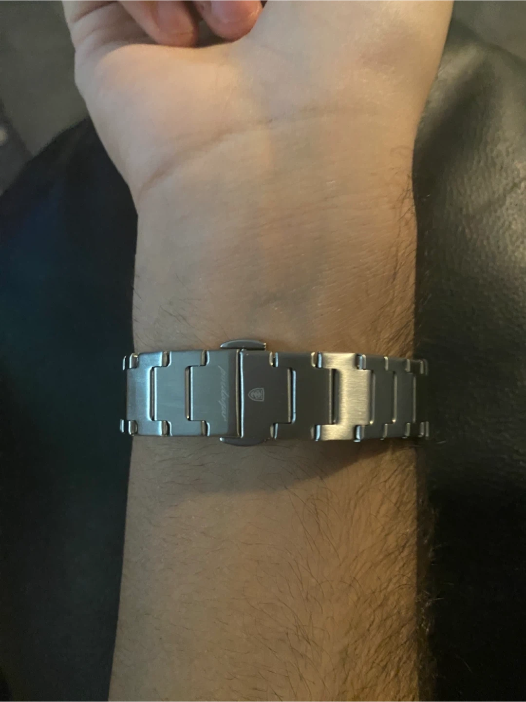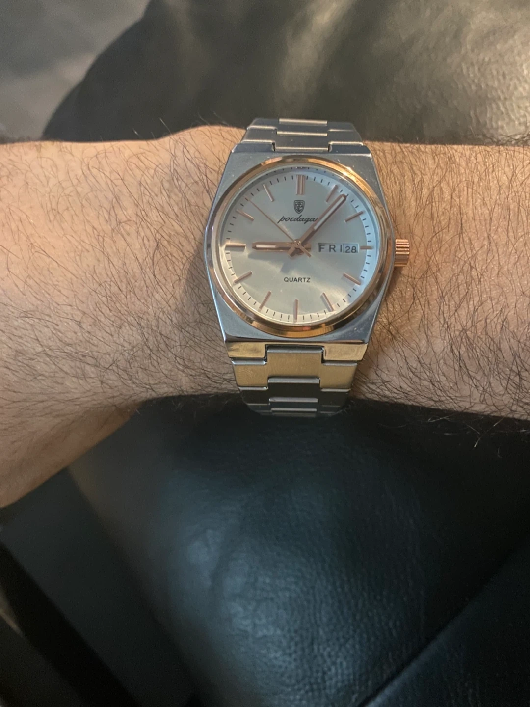 A POEDAGAR 786 watch with a quartz movement. It features a stainless steel strap and a Hardlex dial window. The dial diameter is 35MM and the band width is 24MM. This watch has a push-button hidden clasp.u comes with box