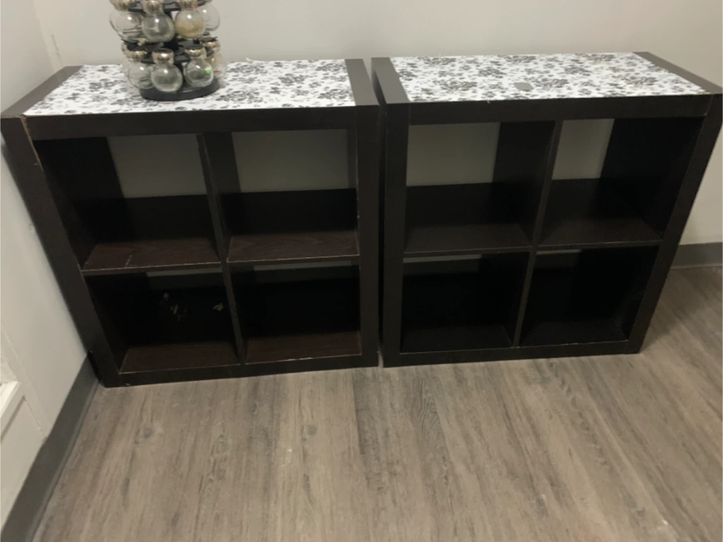 These are two IKEA KALLAX 8-cube organizers. They have a decorative white floral paper on top surfaces. Some scuffs visible on sides. They're a dark brown wood-effect finish.