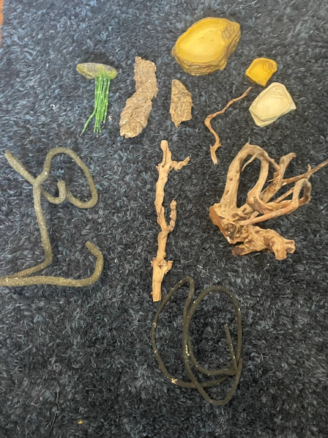 Assortment of artificial plants and natural driftwood pieces for aquarium decoration. Includes various green foliage, rocks and driftwood to add to your aquariums and enclosures alike. Adds natural-looking elements to your scaled pets home.
