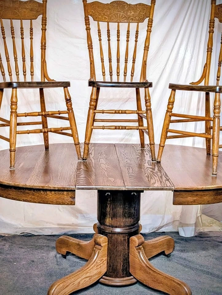 Restored Oak Pedestal Table: Featuring a gorgeous "tiger" grain top that has been stripped and refinished for a smooth, durable surface.