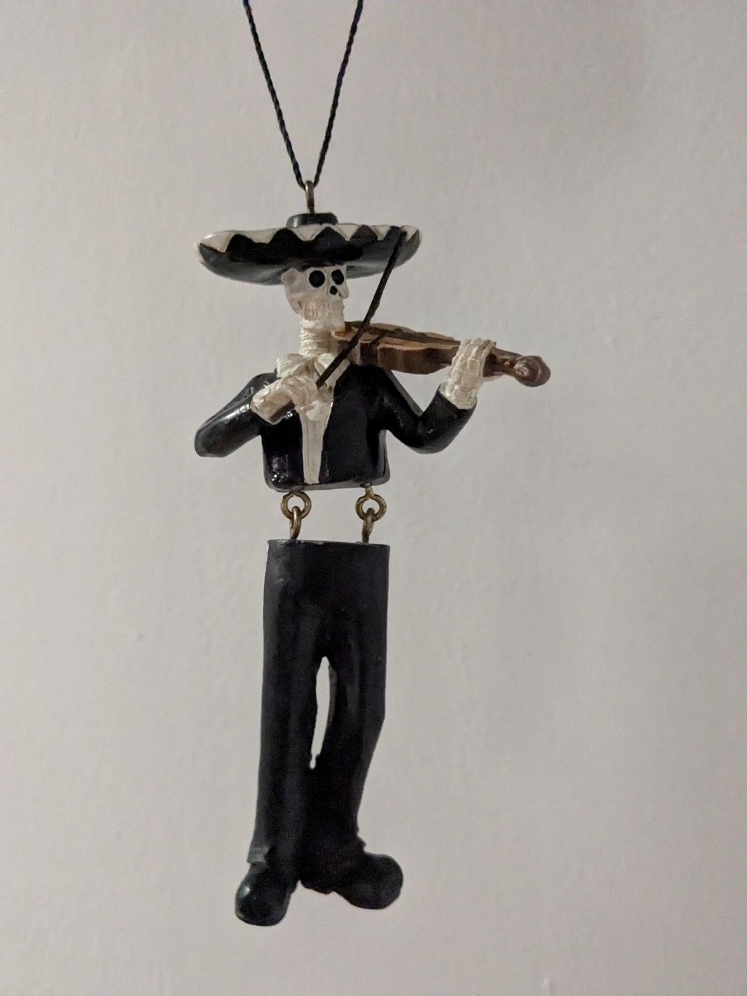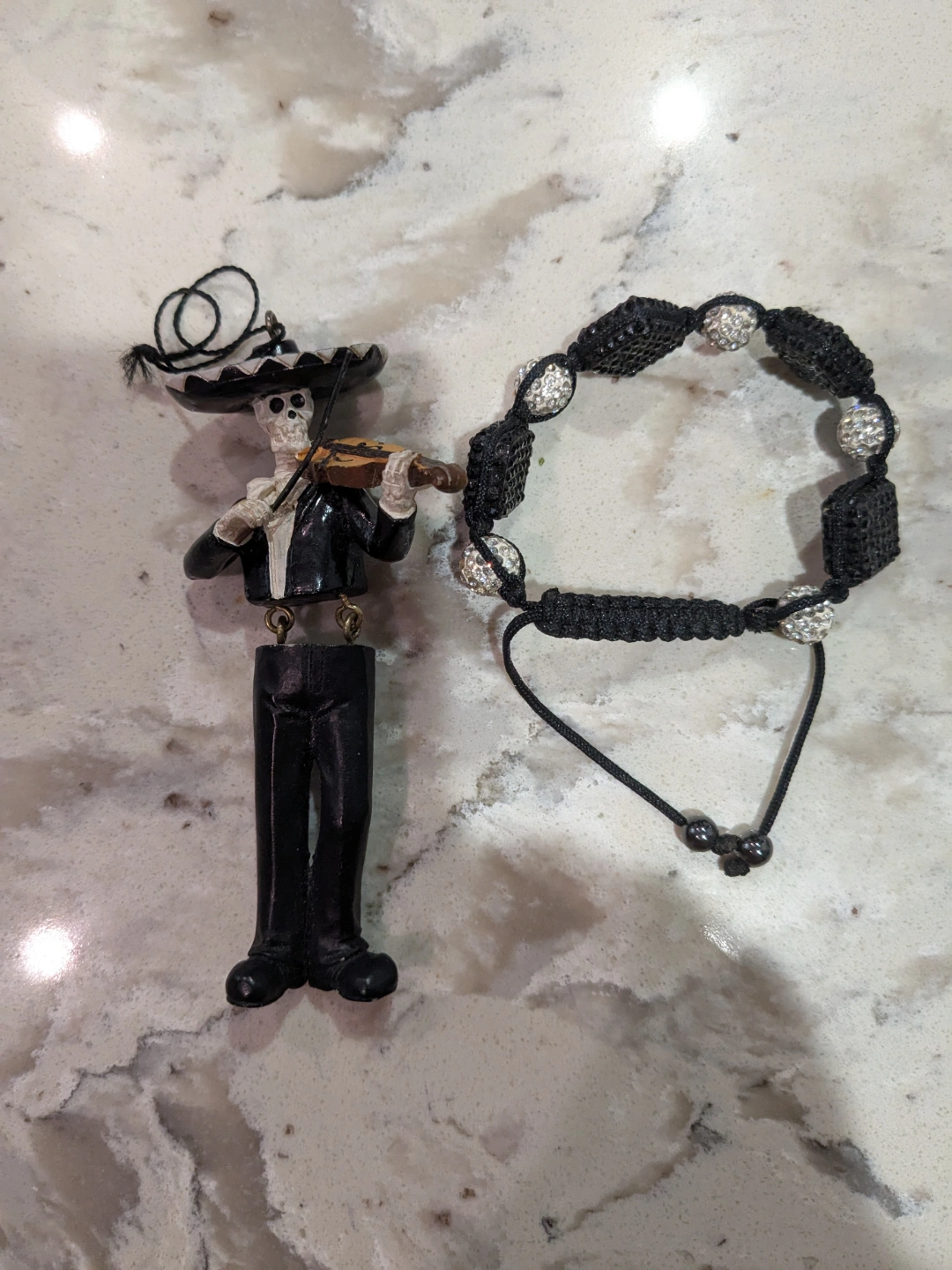 Unique Dia de los Muertos themed set. Includes a skeleton musician ornament playing a violin and a black and silver beaded bracelet. Great for collectors or Day of the Dead enthusiasts. Perfect for adding a festive touch to your home decor.