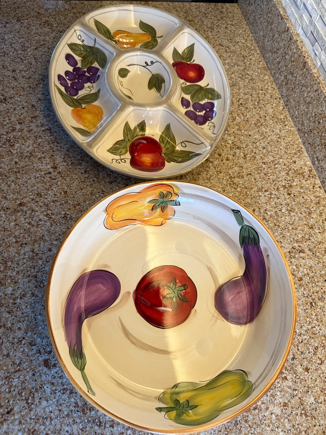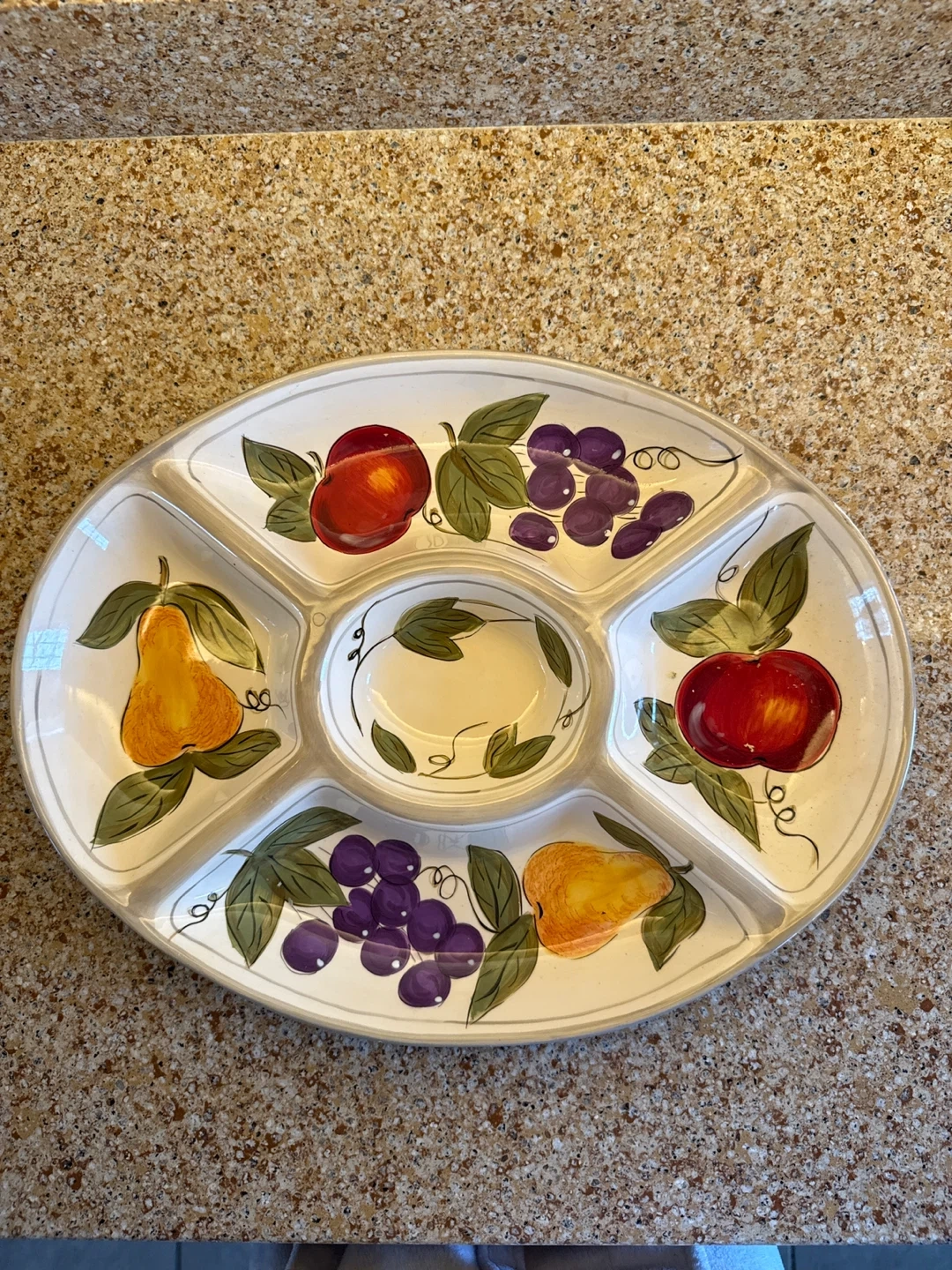 This ceramic serving platter and bowl features a beautiful hand-painted design with colorful fruits on one side and vegetables on the other. It has multiple divided sections for serving snacks or appetizers. It's perfect for parties or gatherings! $10.00 each piece