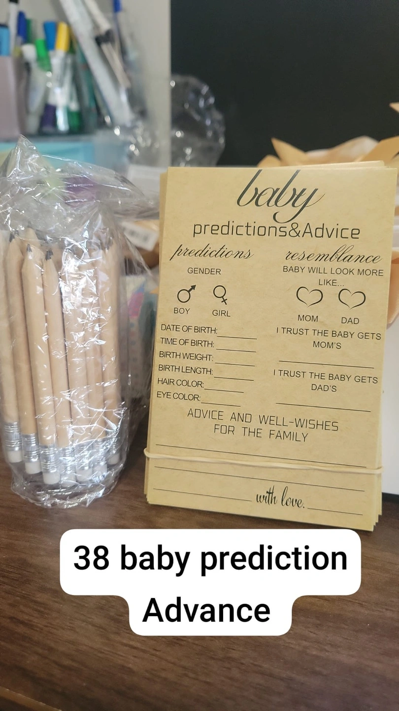 105Set of 38 baby prediction cards. Cards include spaces to write in gender, date of birth, time of birth, birth weight, birth length, hair colour, and eye colour. Also includes spaces to write in who the baby will resemble, advice and well wishes.