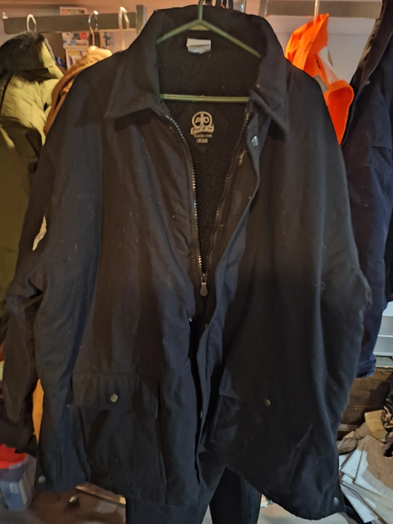 Black work jacket with a zipper closure. Has a fleece lining and a pocket on the left side.