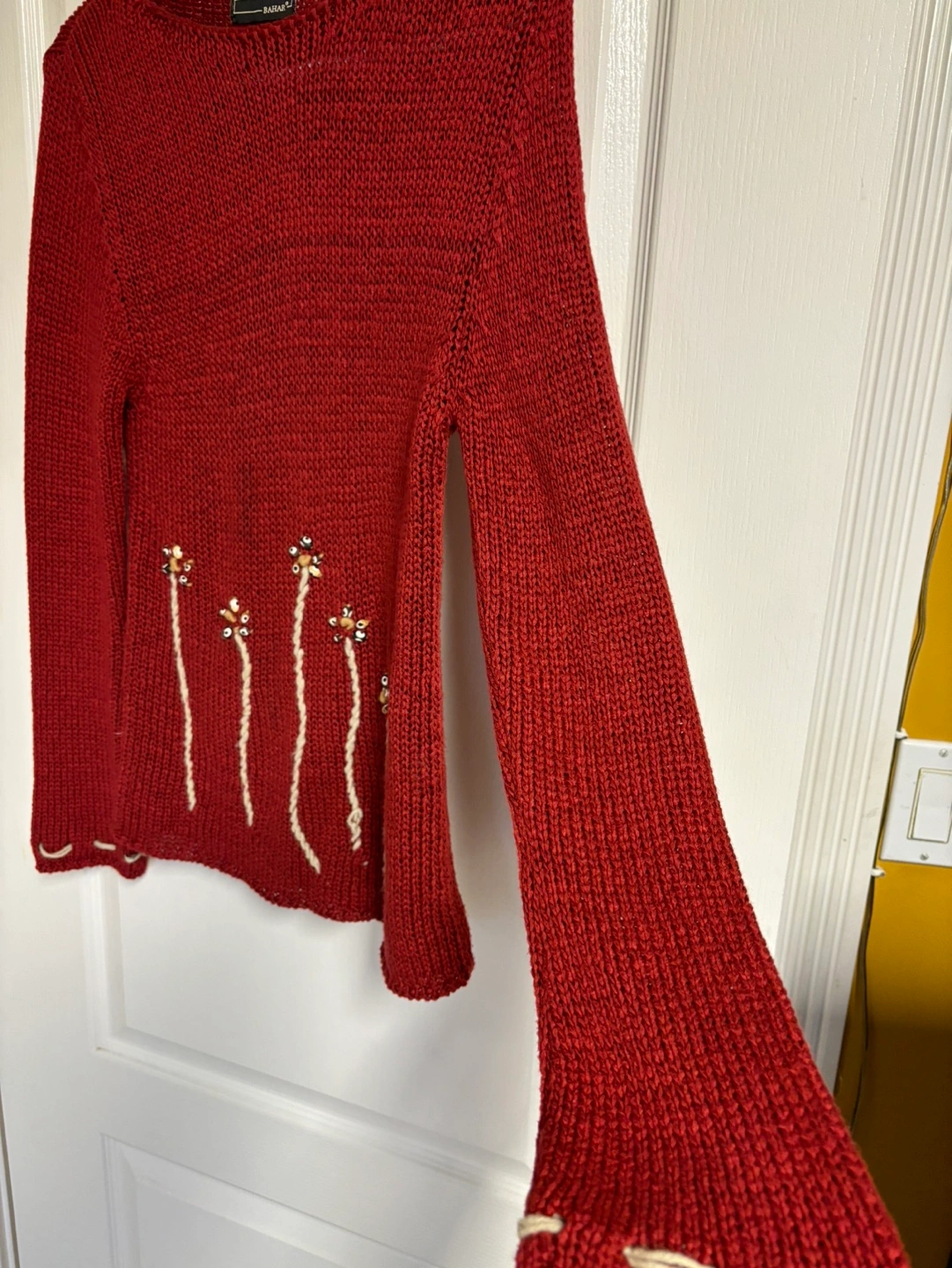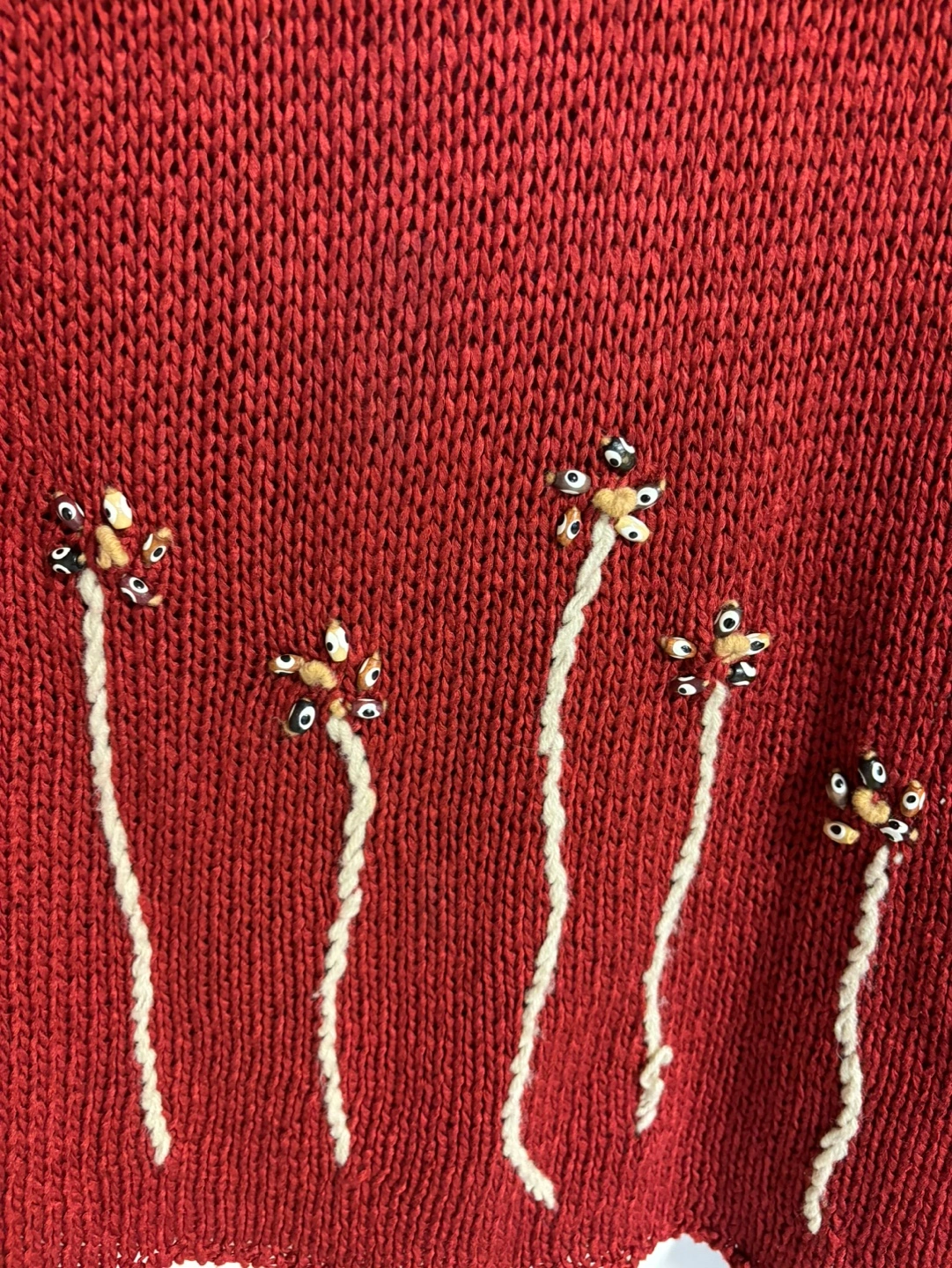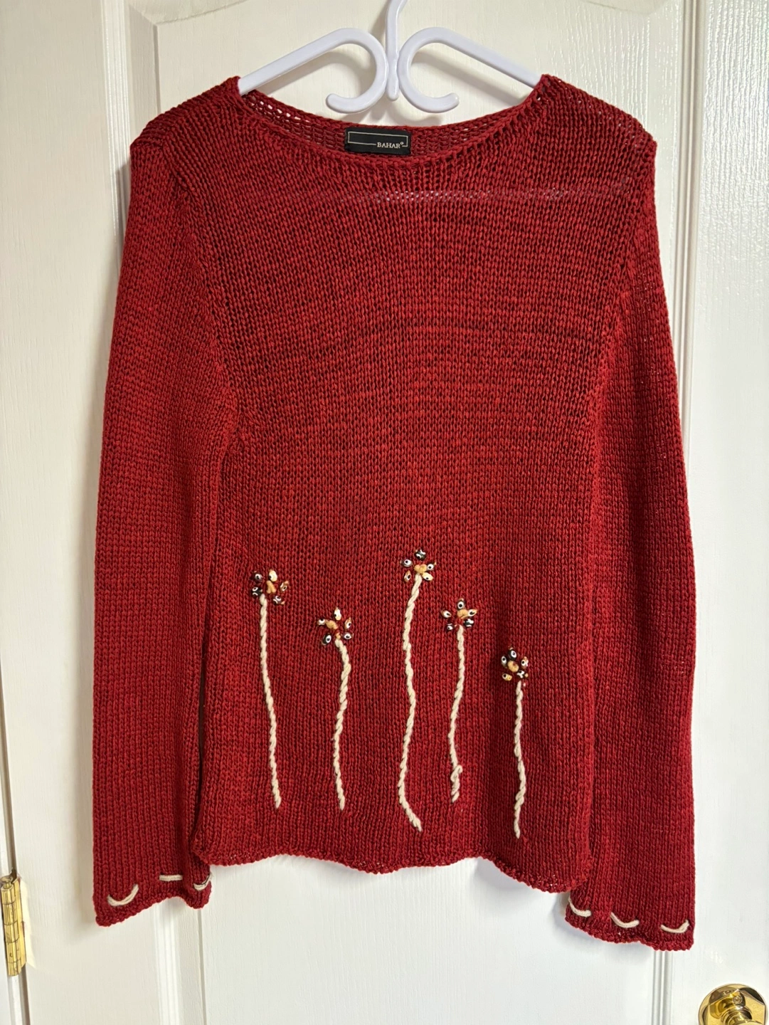 83Red knit sweater with long sleeves. Features beaded flower embellishments on the front.