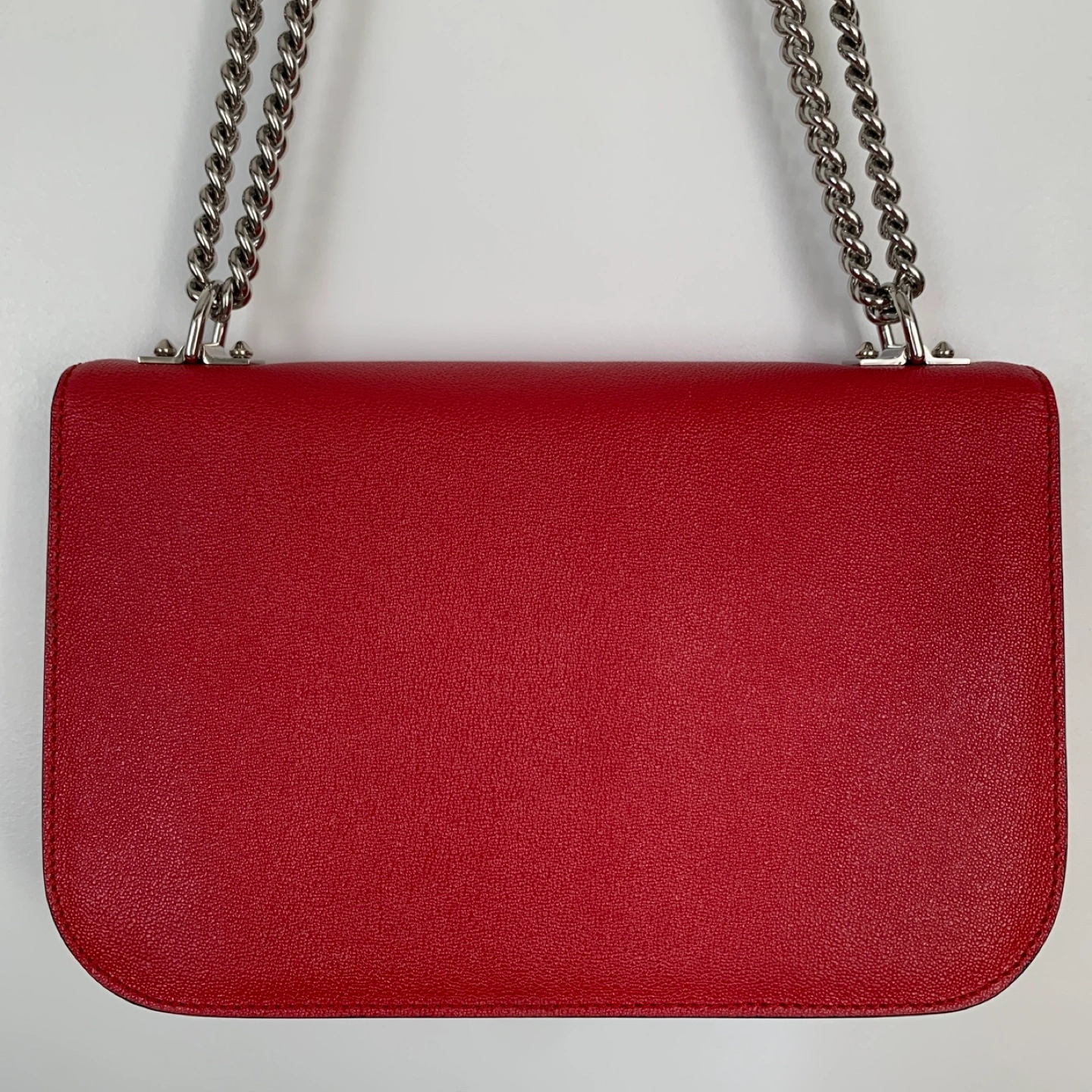 Authentic. Red leather chain bag with silver hardware and a suede interior. Includes a dust bag.