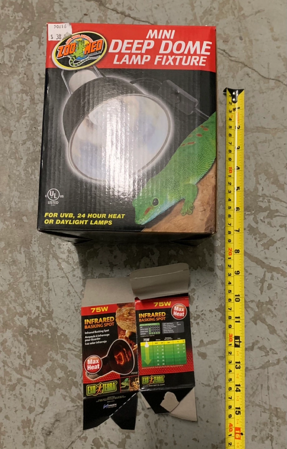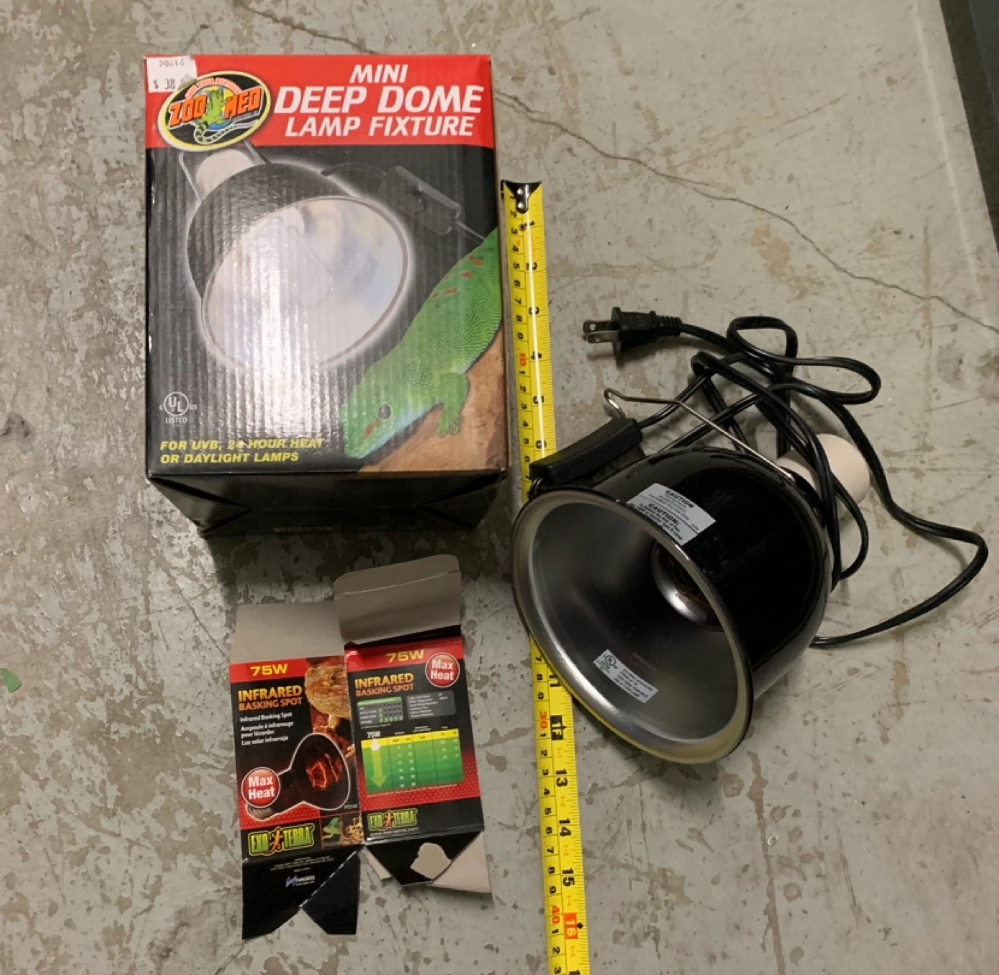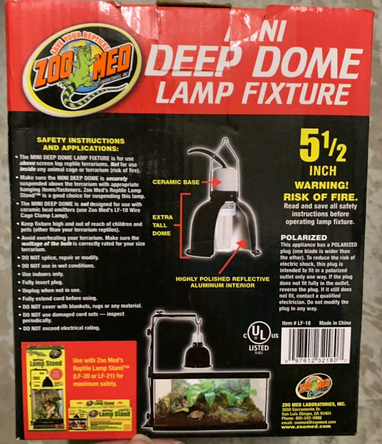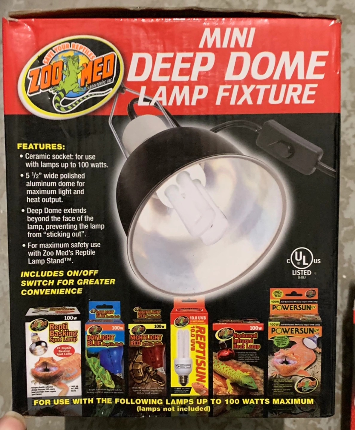 365Mini deep dome lamp fixture for reptile terrarium. Includes on/off switch. Includes the lightbulb in the box on first/second photo