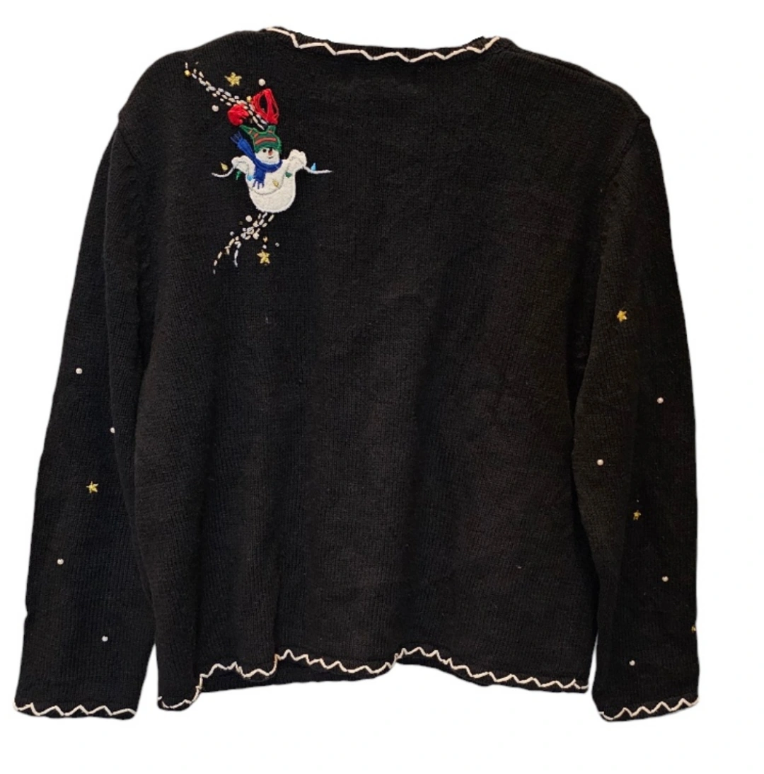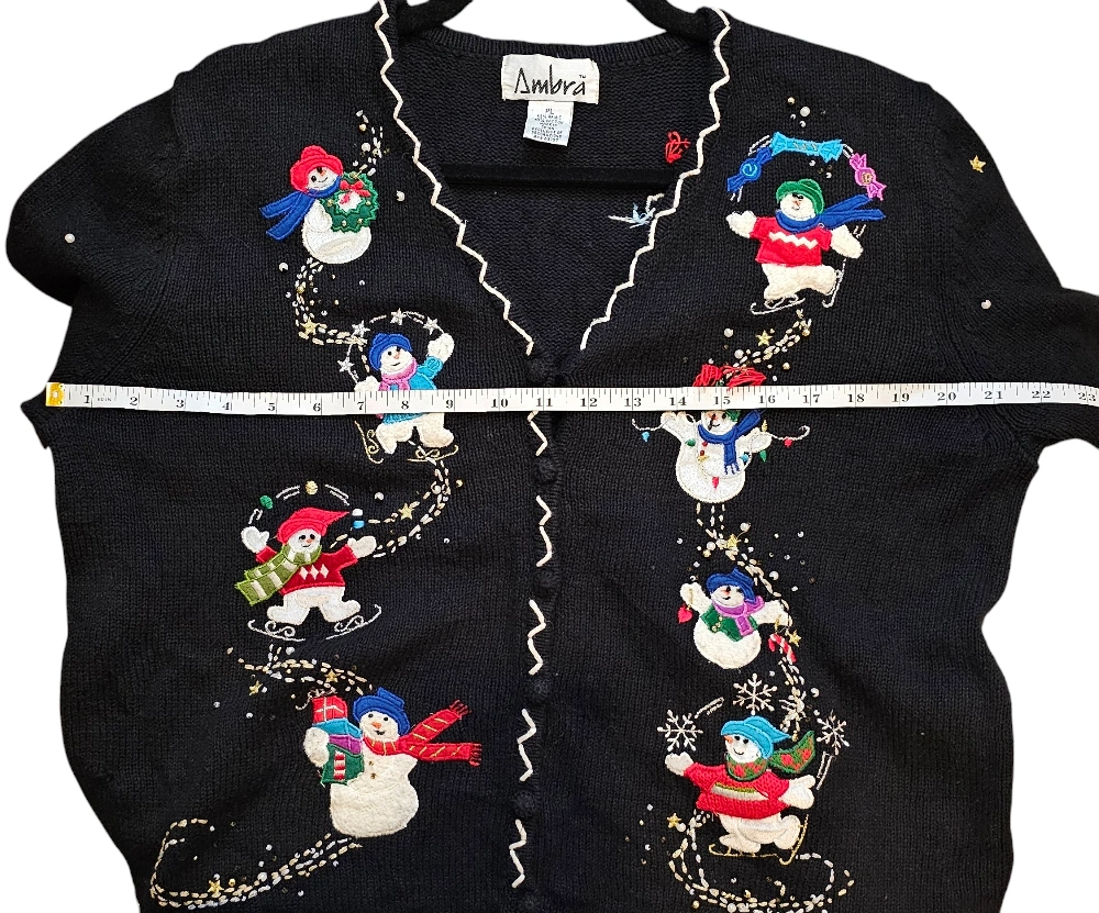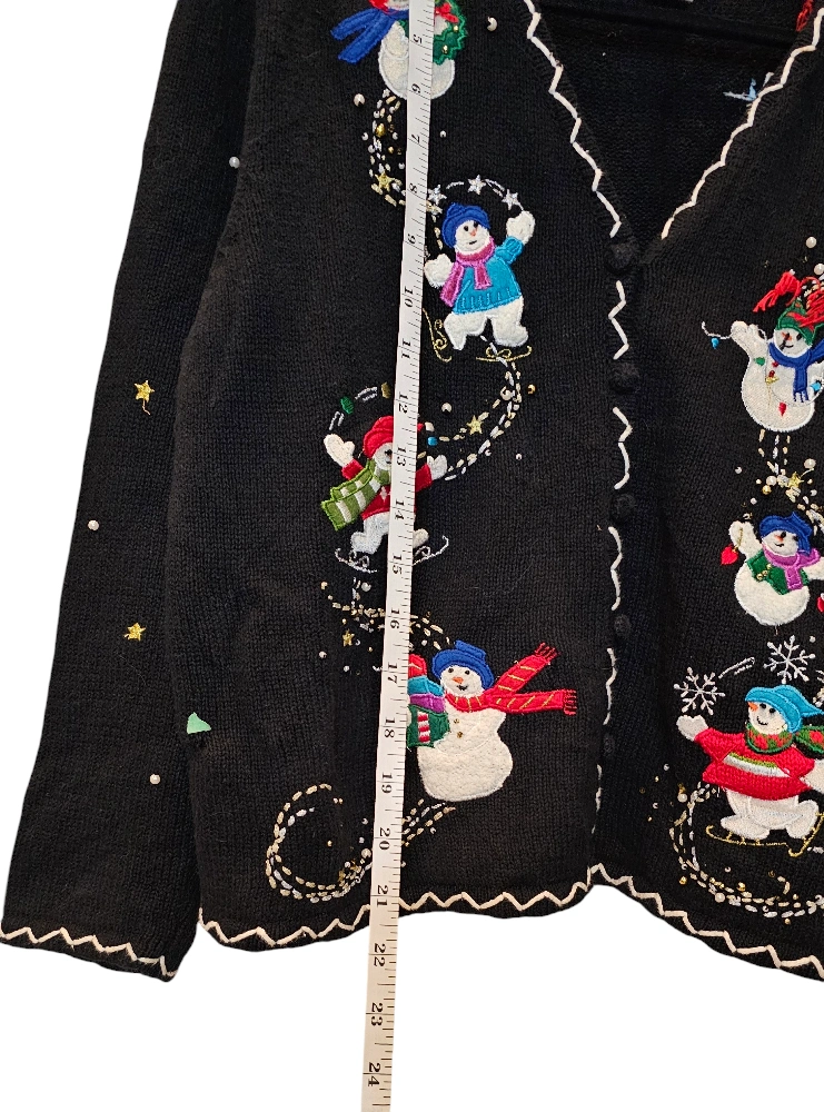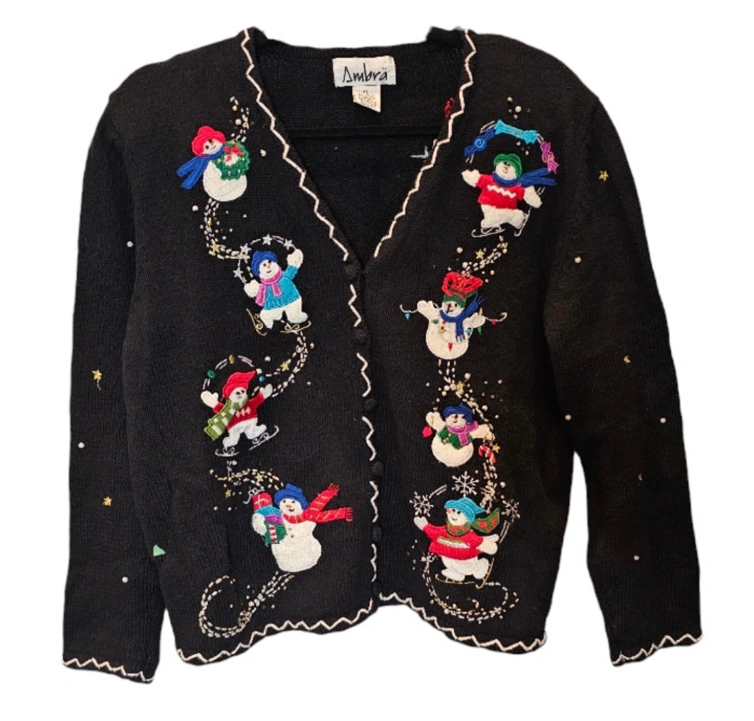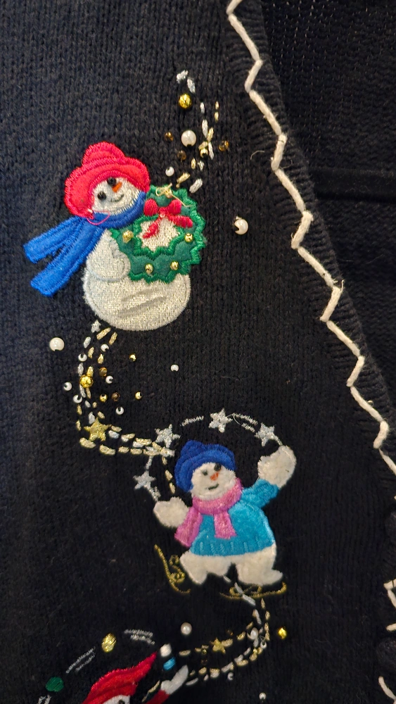 The snowmen are made of several pieces of felt patched together onto the sweater. It's super fun, cute and comfy!