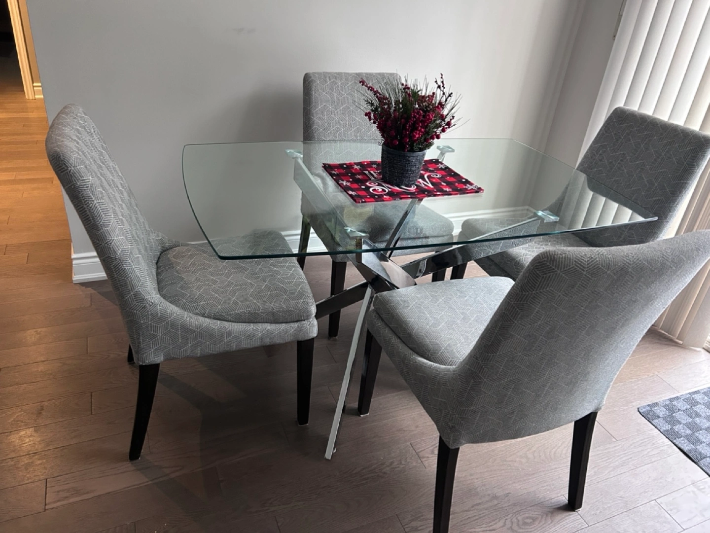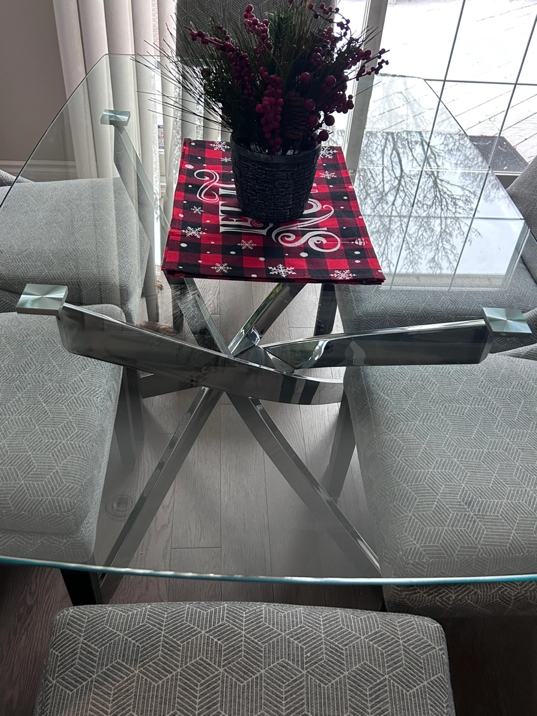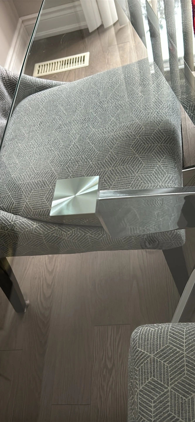 Beautiful glass dining table. Tempered glass. Chrome legs. Excellent condition. No cracks. Slightly curved on the sides. Rounded off edges. Can seat 4-6 people.