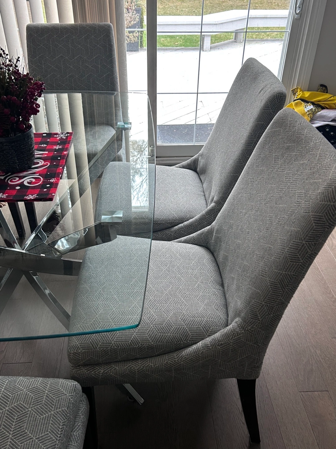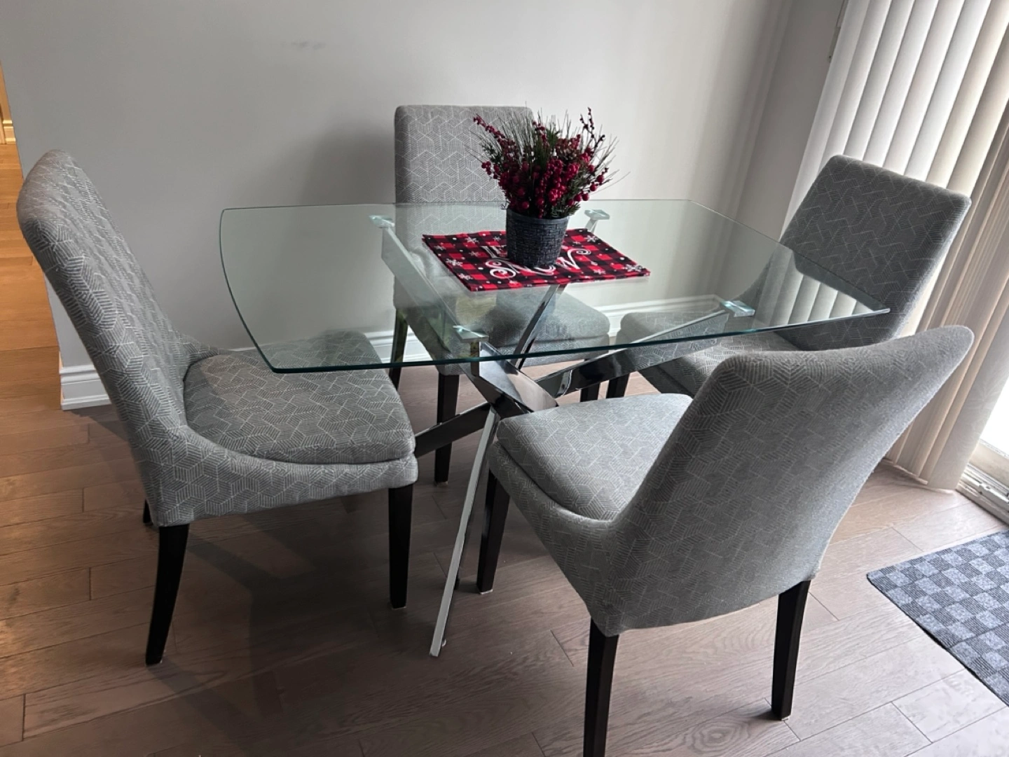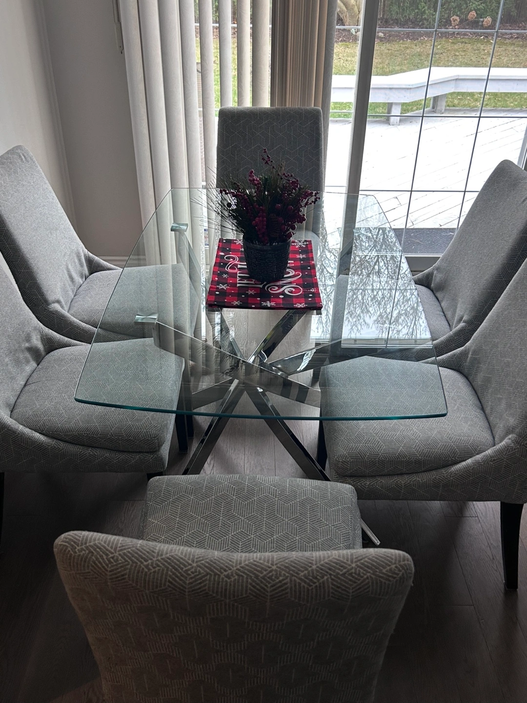 Beautiful glass dining table. Tempered glass. Chrome legs. Excellent condition. No cracks. Slightly curved on the sides. Rounded off edges. Can seat 4-6 people.