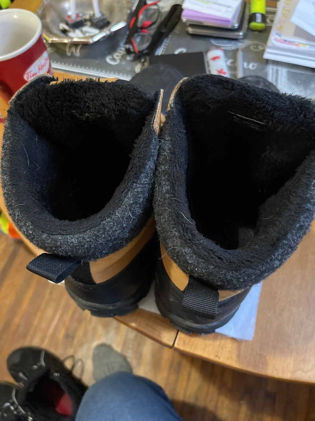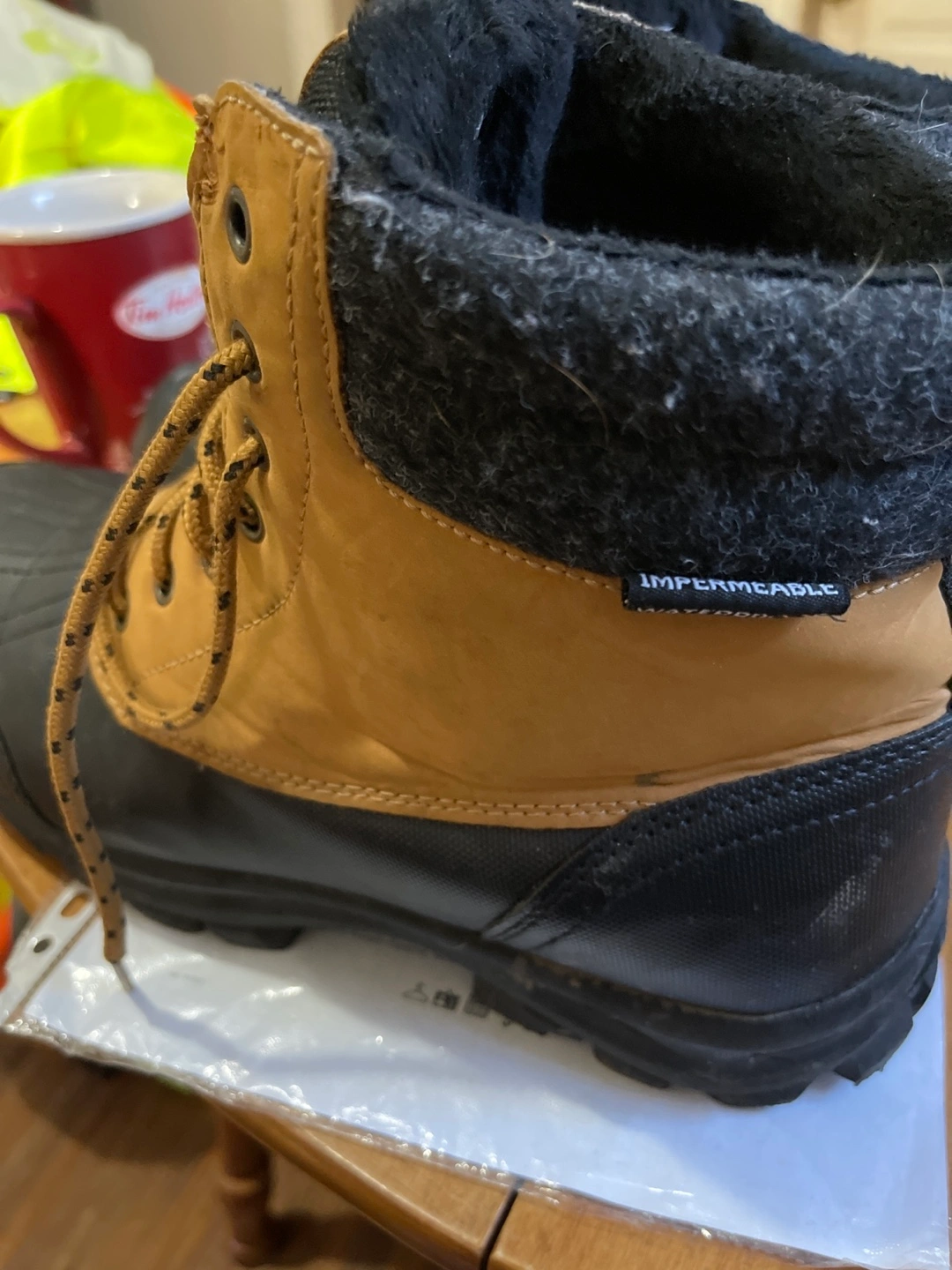 Warm winter boots with a black and tan colour scheme. Lace-up design. Impermeable.has warm liner size 11 in good shape nice warm winter boots.