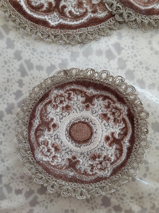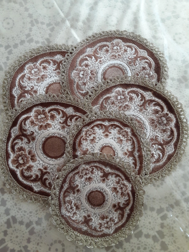 Set of 6 round, brown/beige/cream-coloured embroidered placemats with gold-coloured trim, ranging in size from 7.5-9.5" diameter.