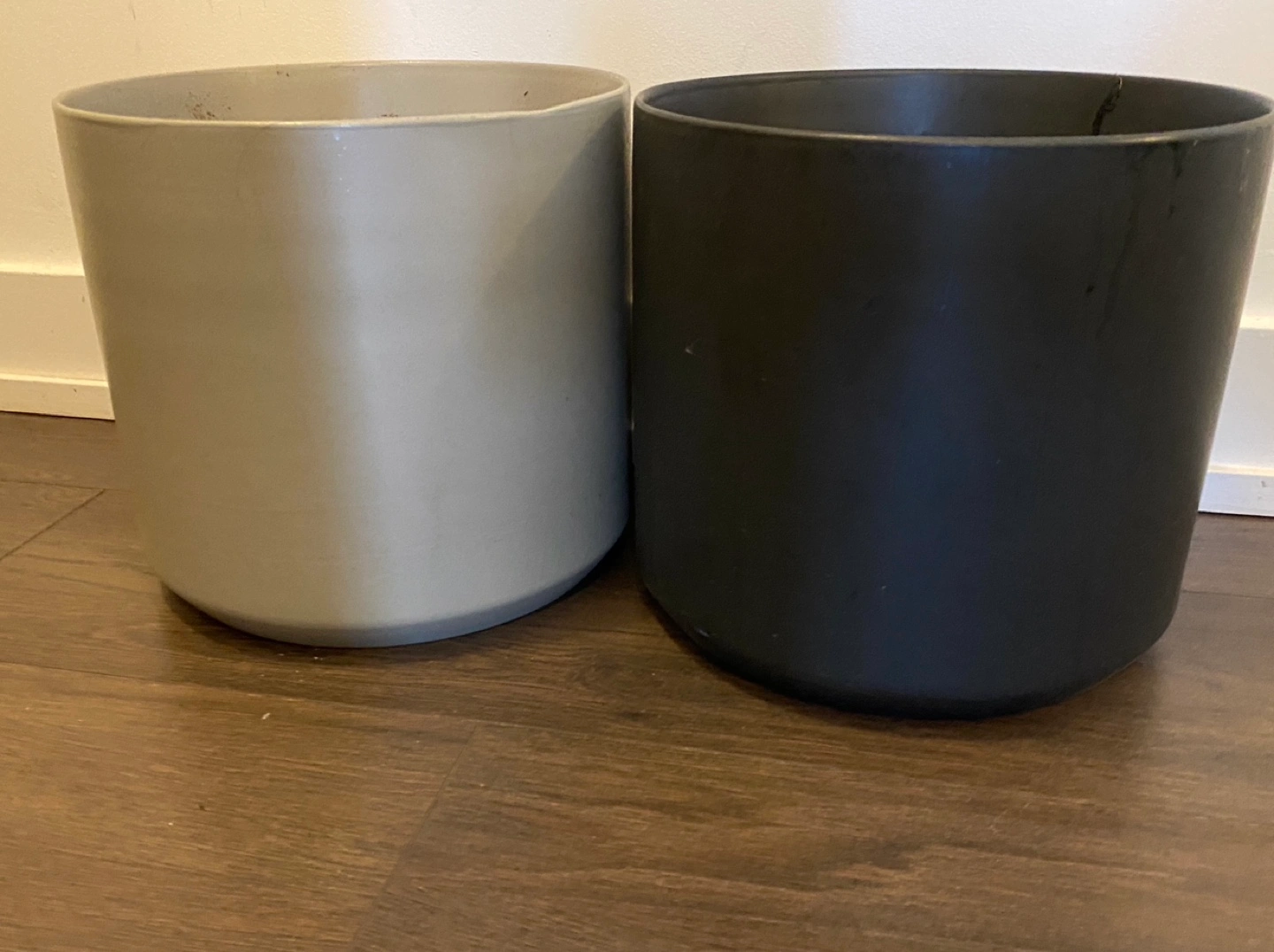 Two large plant pots, in black and grey. Good quality. Bought from promisesupply. I removed the plants from them and not planning on using these in the near future.