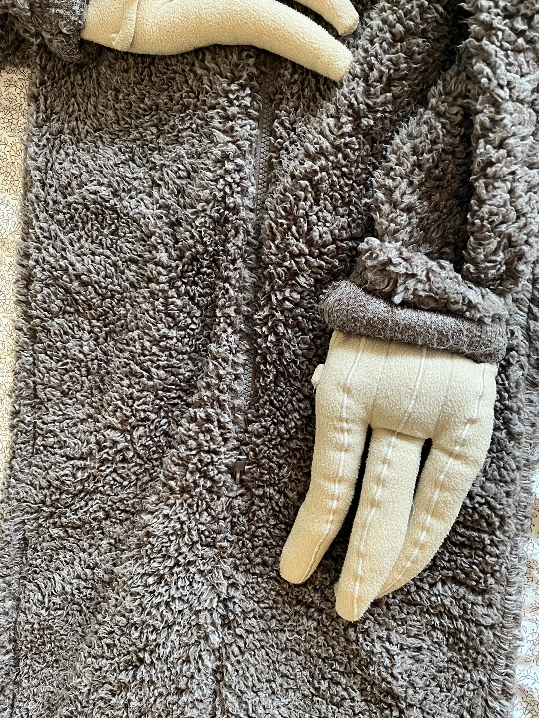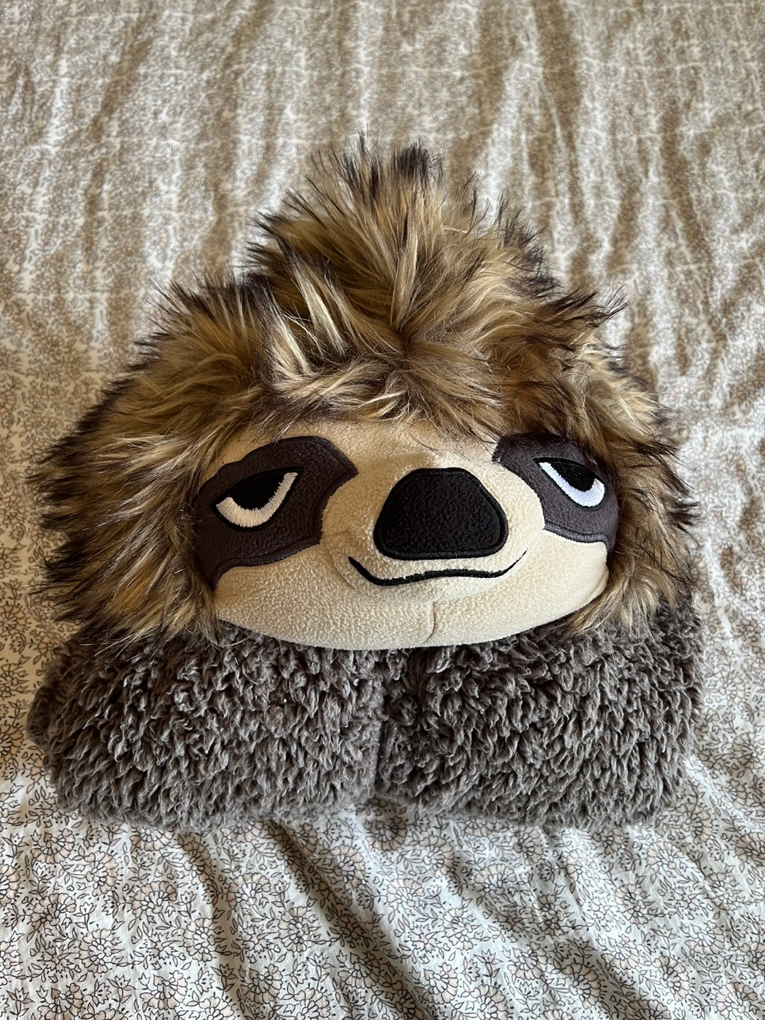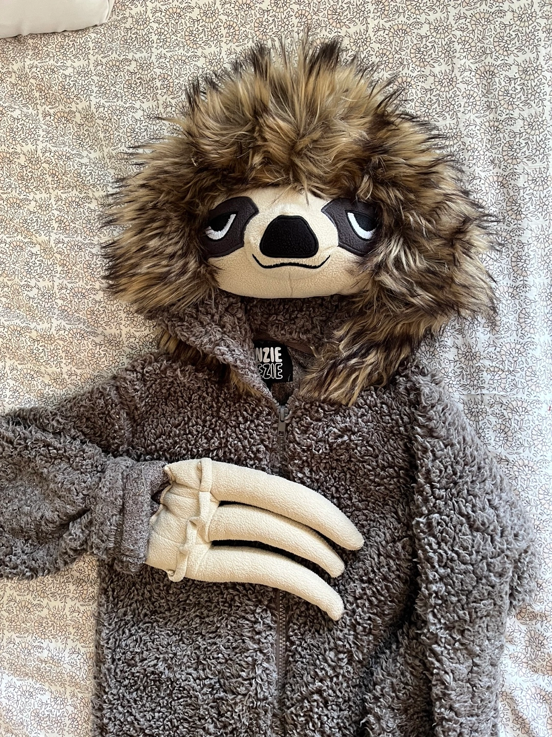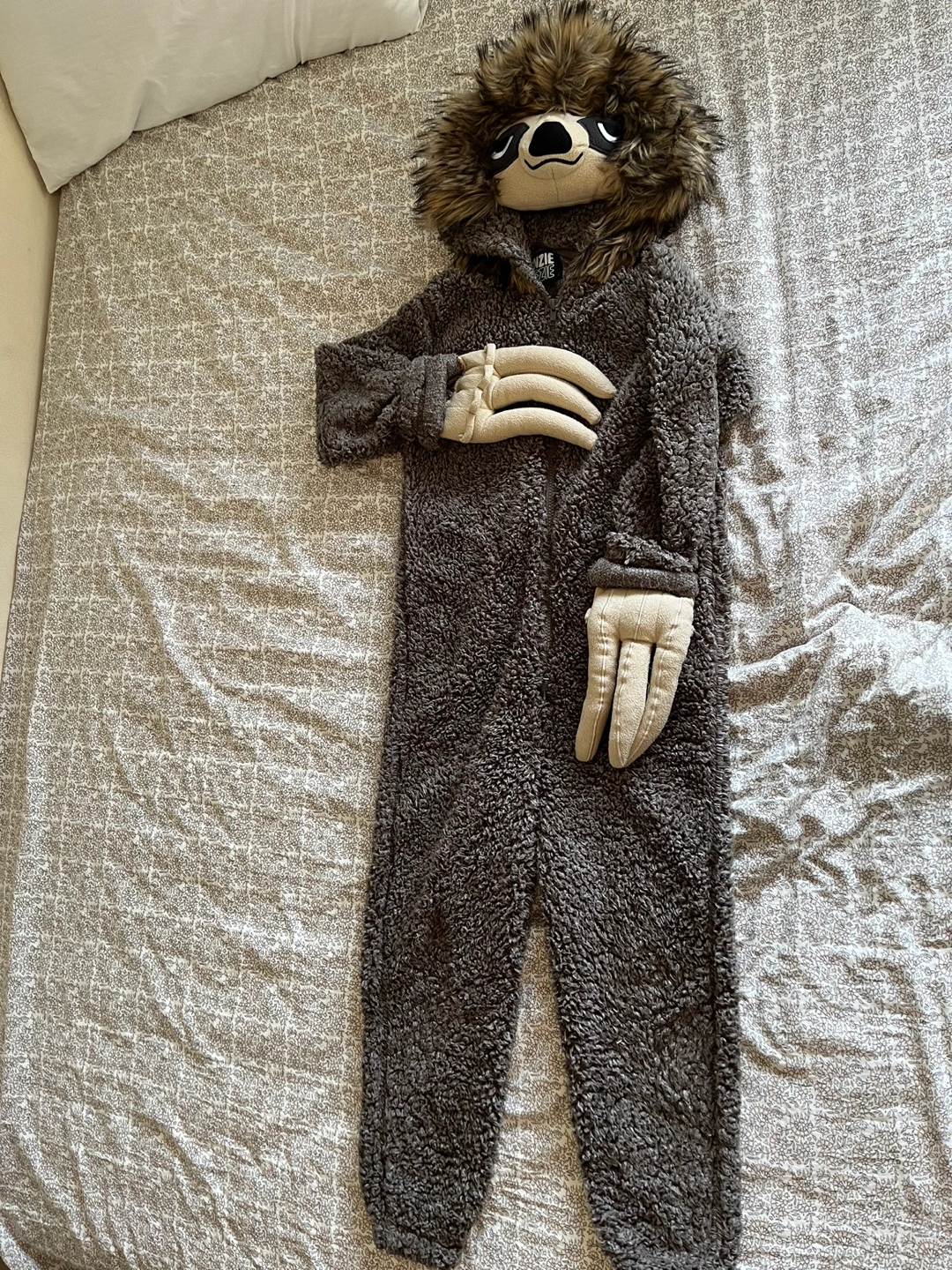 1000+Kids size 7/8 onesie with a sloth design. Brown and beige fuzzy material with a zipper closure. Has attached sloth hands. Wore once Like new