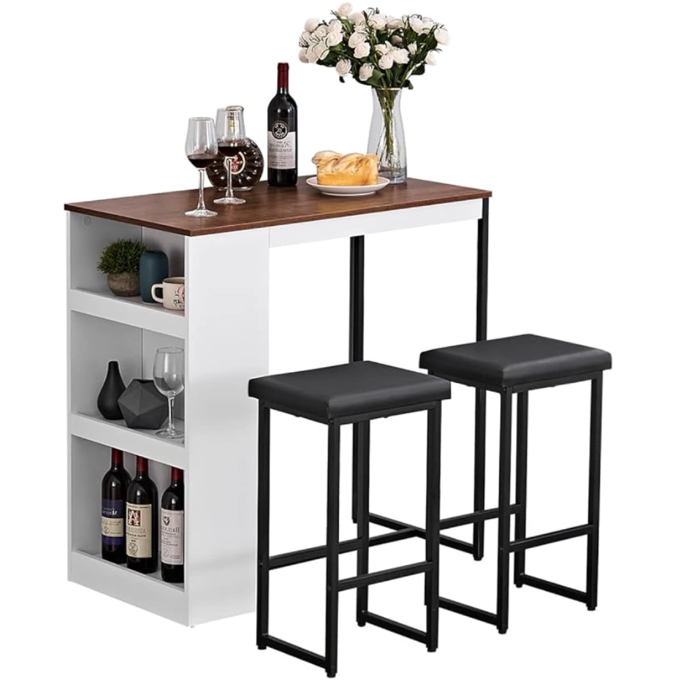 Counter-height bar/dining table featuring open shelving for storage. Great for a small kitchen or apartment. Will include one faux leather-upholstered stool (as pictured) for free!