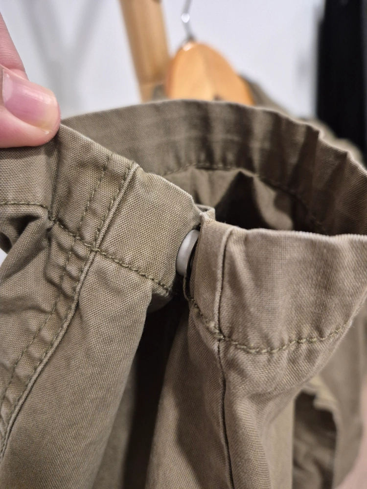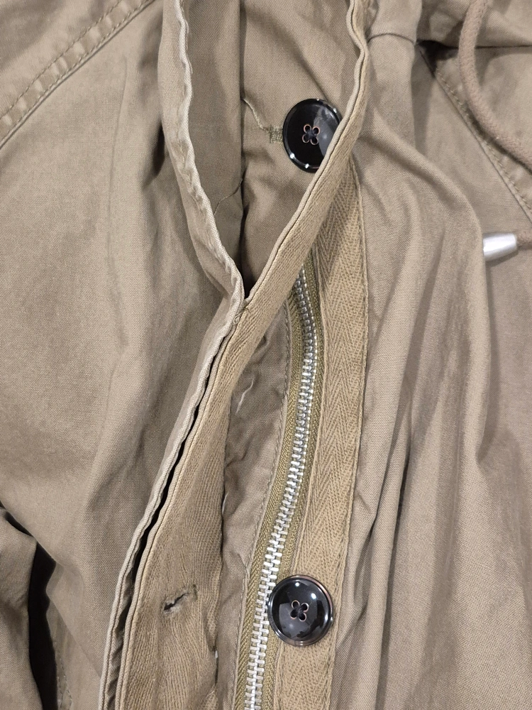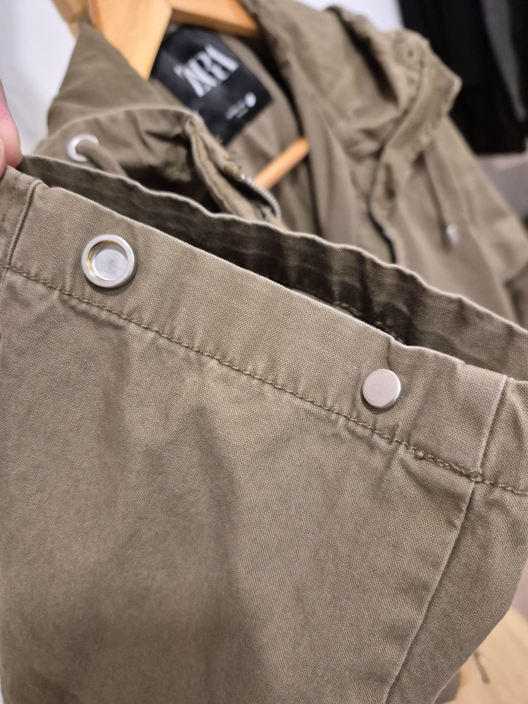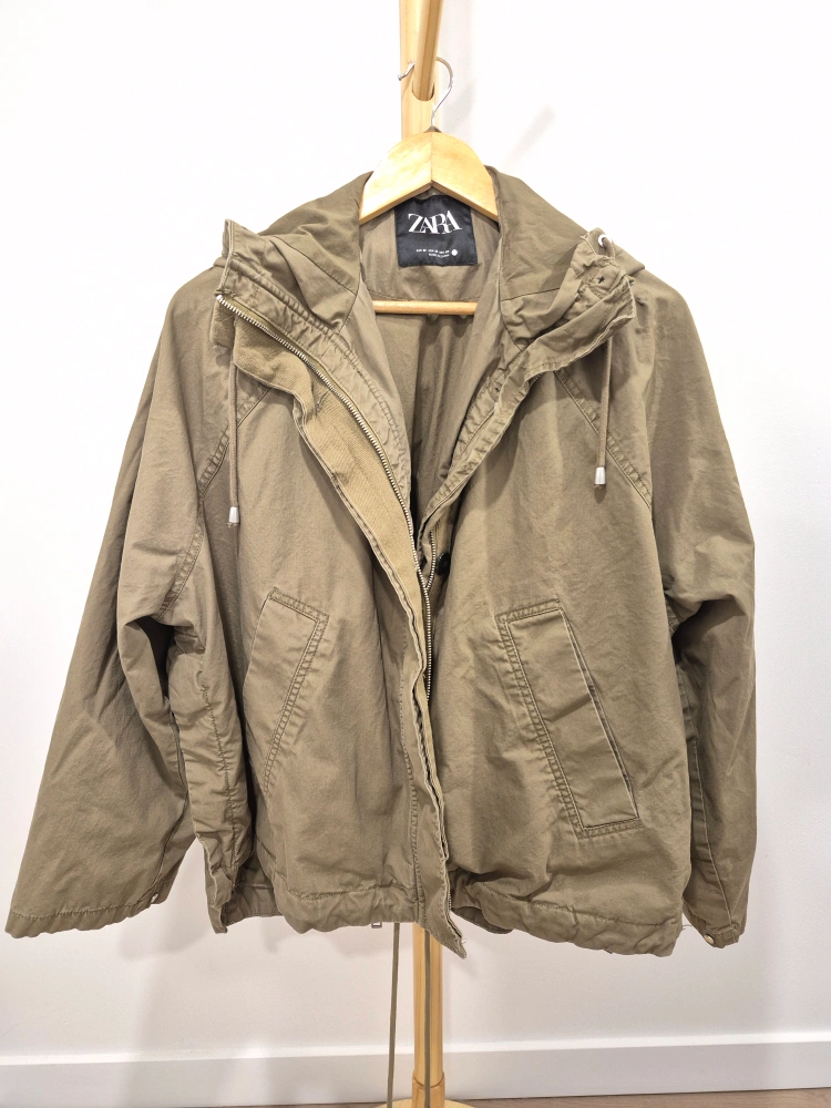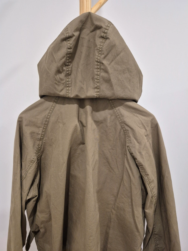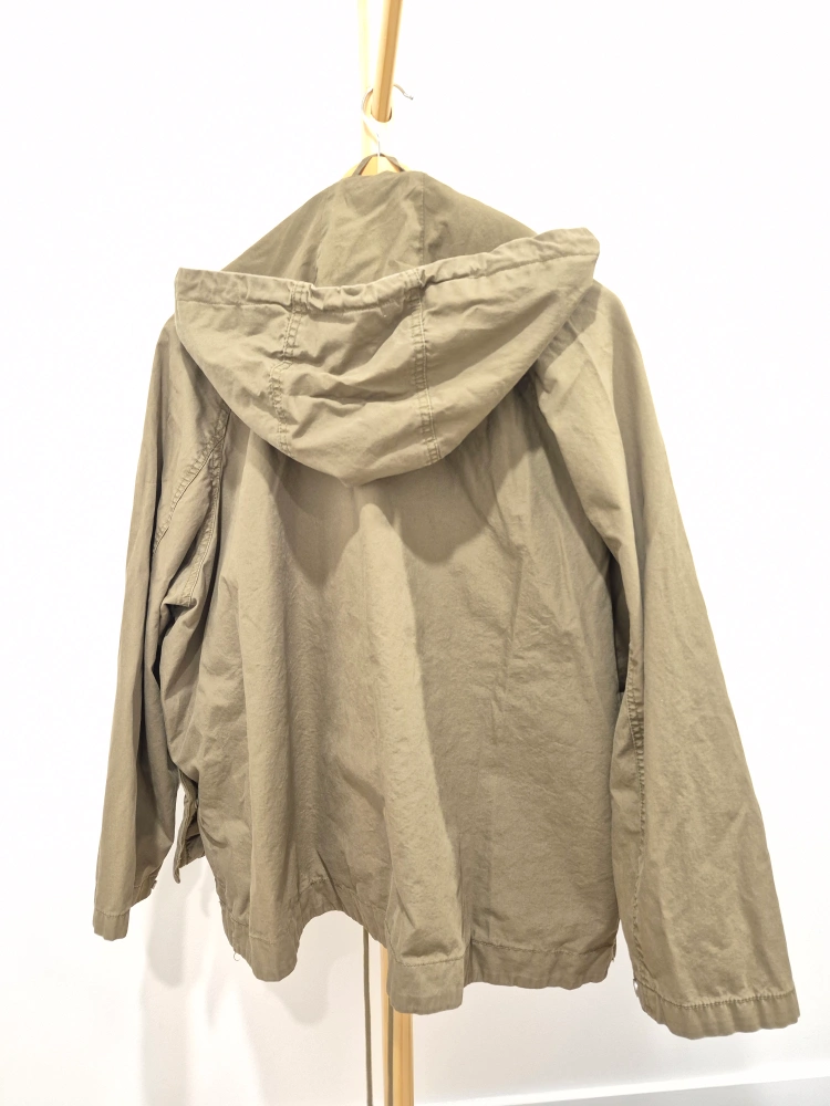 385Green hooded jacket. Zipper and button closure. Two pockets on the front.
