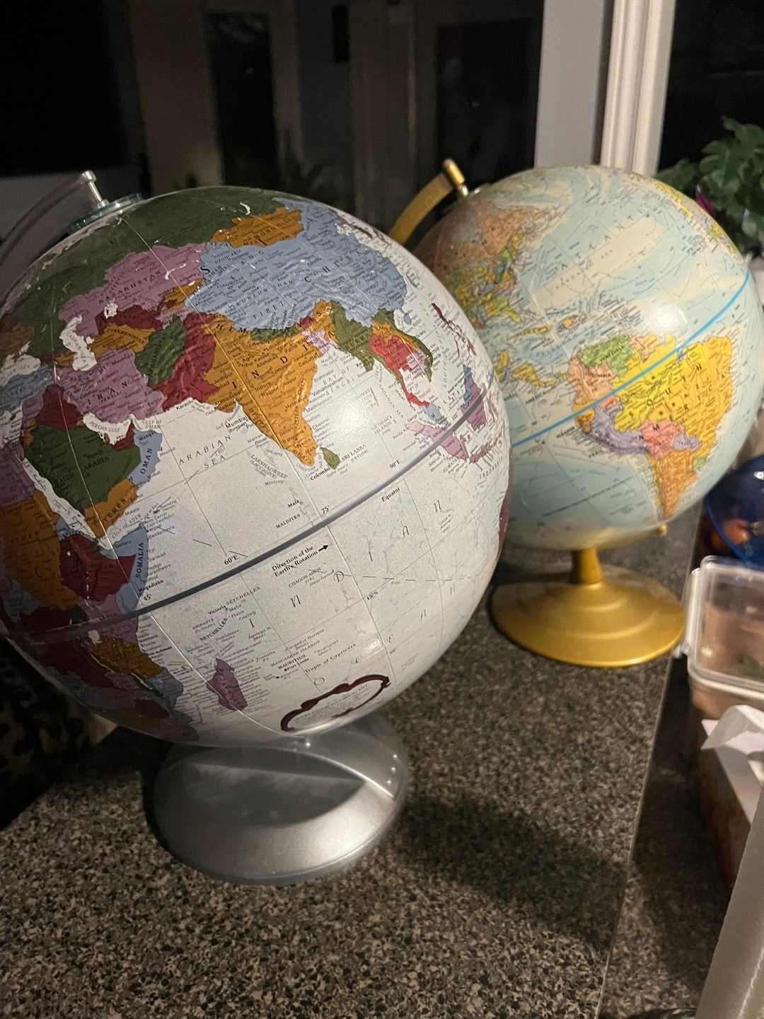 240Vintage globe with a sturdy stand. Includes both the Western and Eastern hemispheres and a textured map. $30 each