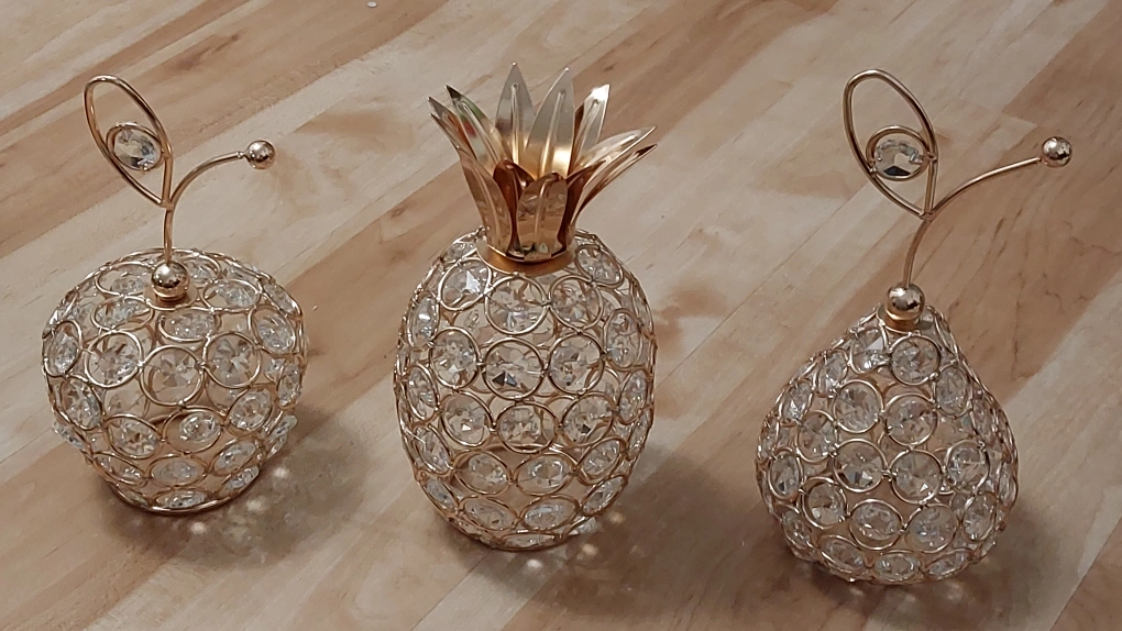 1000+BNIB 3pcs Set Golden Crystal Fruit Ornaments - Apples, Pears & Pineapples with Adjustable Leaves | Handcrafted Tabletop Centerpieces for Home & Wedding Decor | Perfect for Christmas & Holiday Celebrations multiple sets available Smoke free and pet free home Kindly note all sales are final and no return or refund Please check my other listings aswell😊