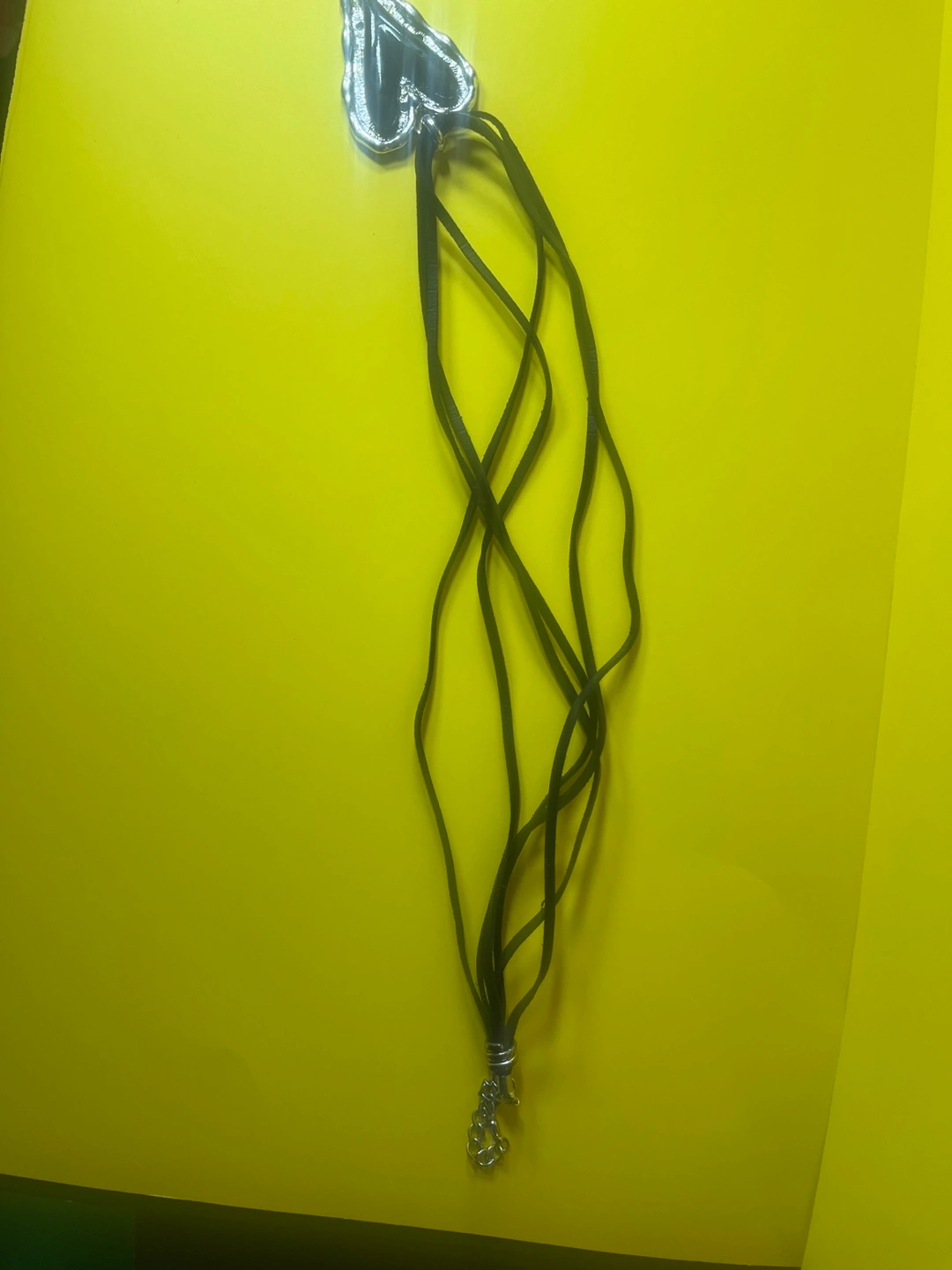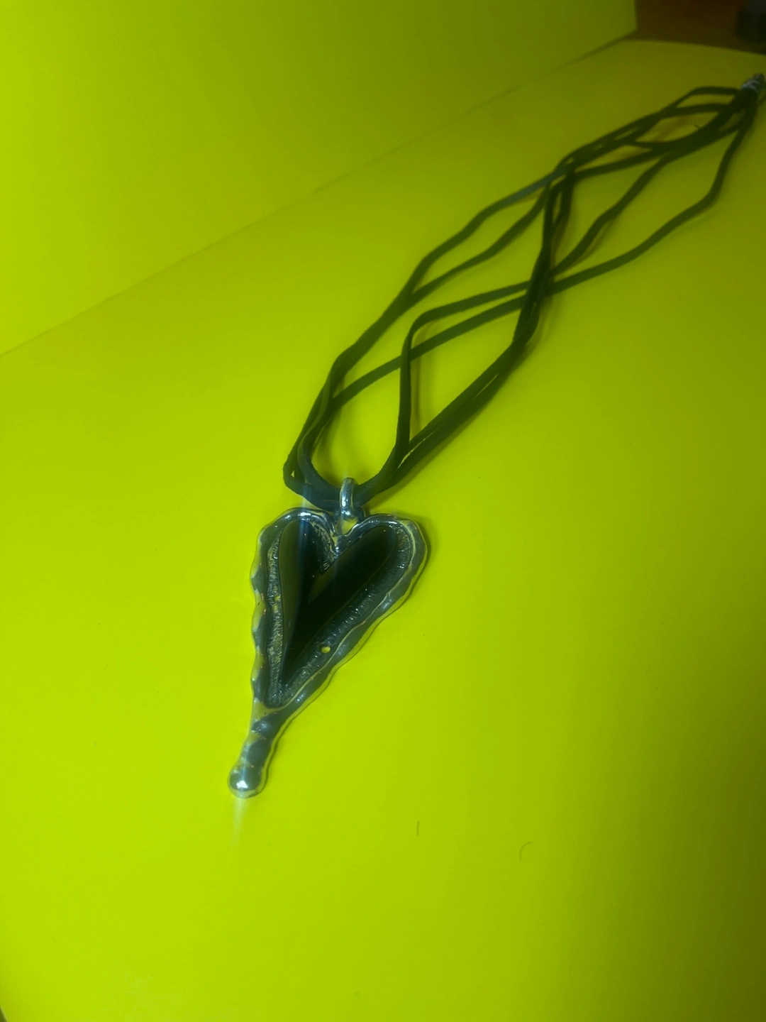 Silver-tone heart pendant on black cord necklace. The pendant has a unique, textured design.