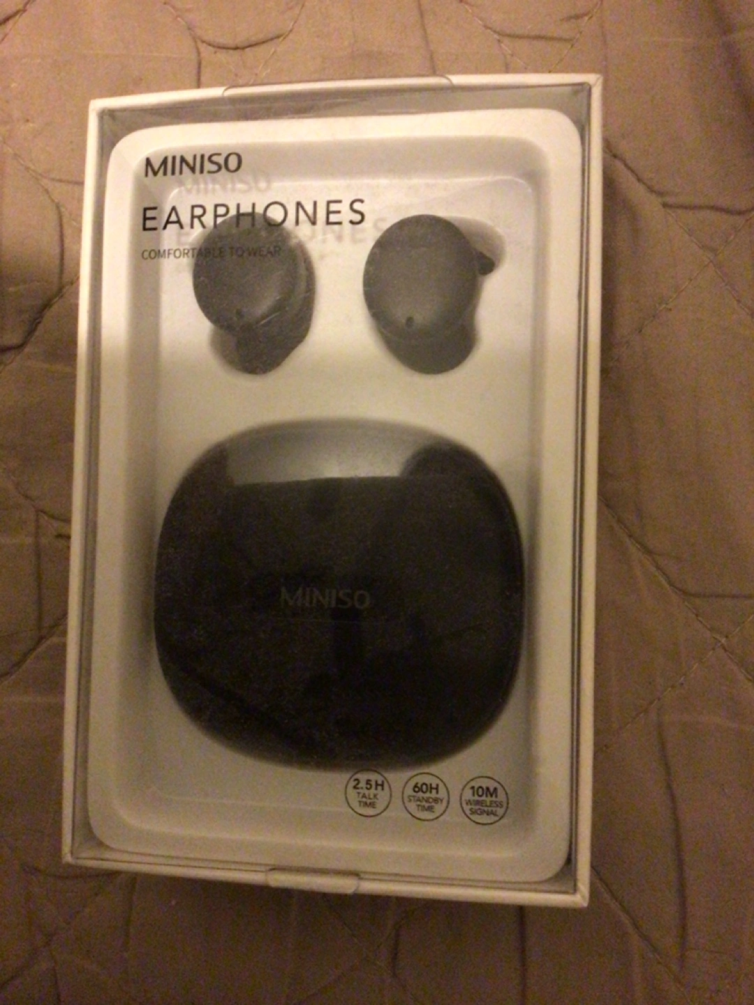 Wireless earphones. Black colour. Comes with charging case. Comfortable to wear. 2.5 hours talk time, 60 hours standby time, 10m wireless signal.