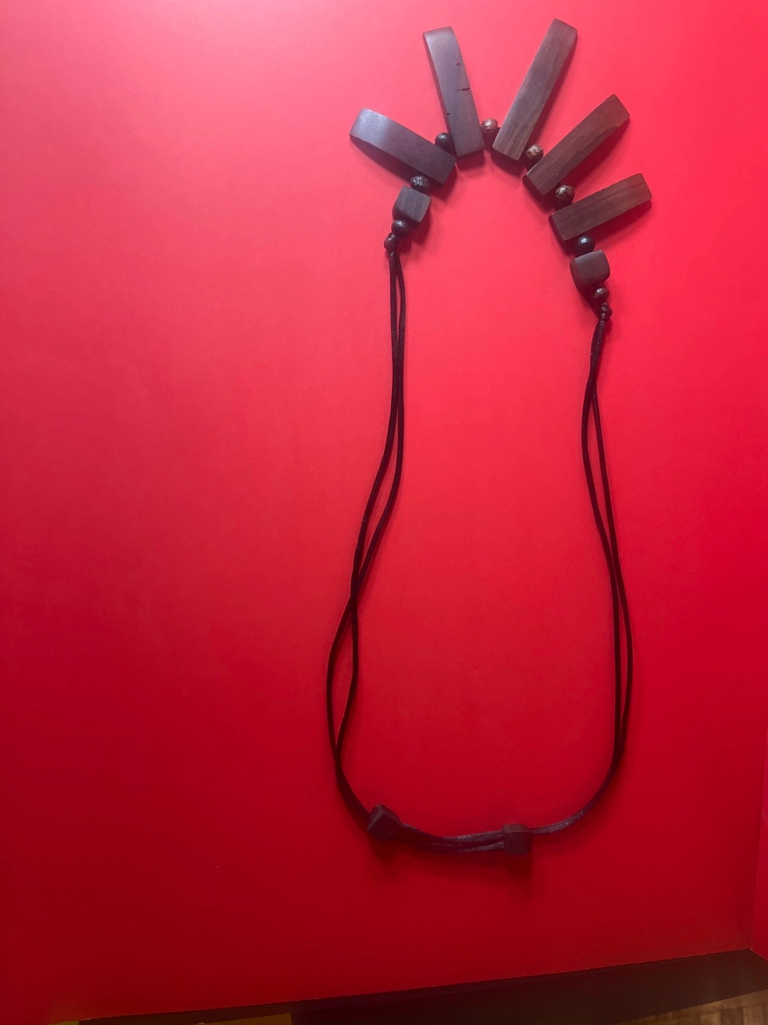 Dark brown wood statement necklace. Features a fan-shaped design of five wood pieces and black beads. The necklace is on a black leather cord with a square wood piece on the closure.