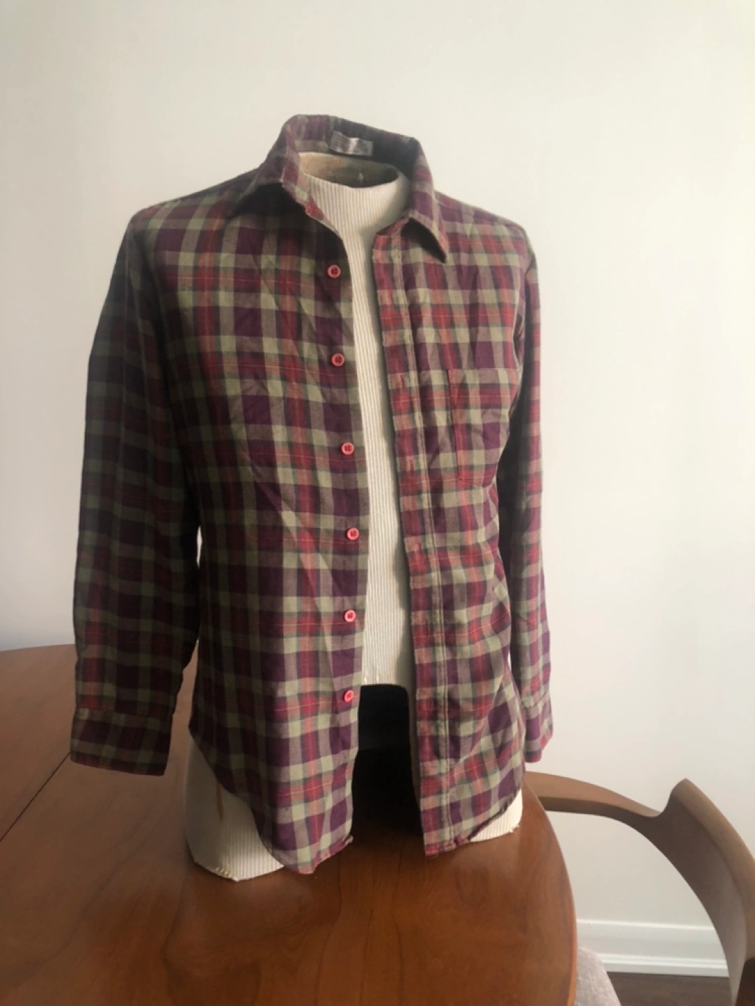 Long-sleeve button-up shirt in a plaid pattern. Red, green, and grey colours. Made in Korea. 📍Spadina/Bloor 💸 Bundle other items for additional deals! Will be posting a ton of items.