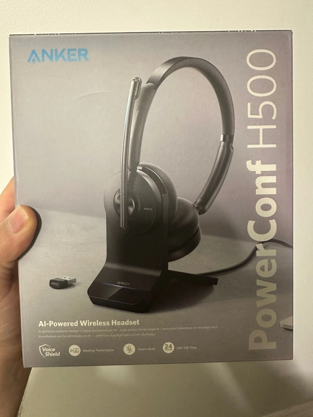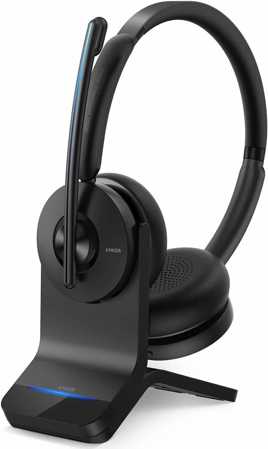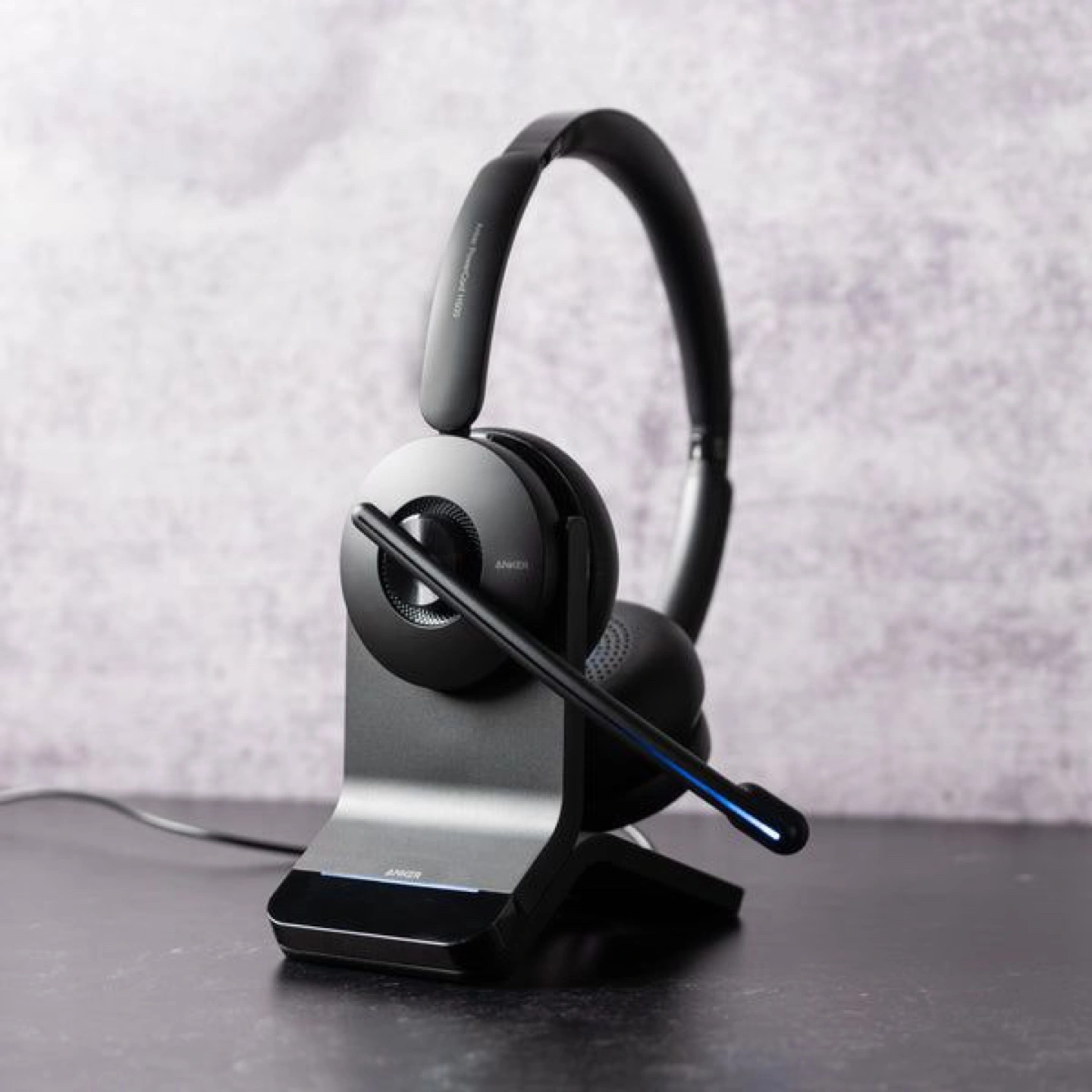 Wireless headset with charging stand, includes USB receiver. AI-powered noise cancellation. 24-hour talk time.