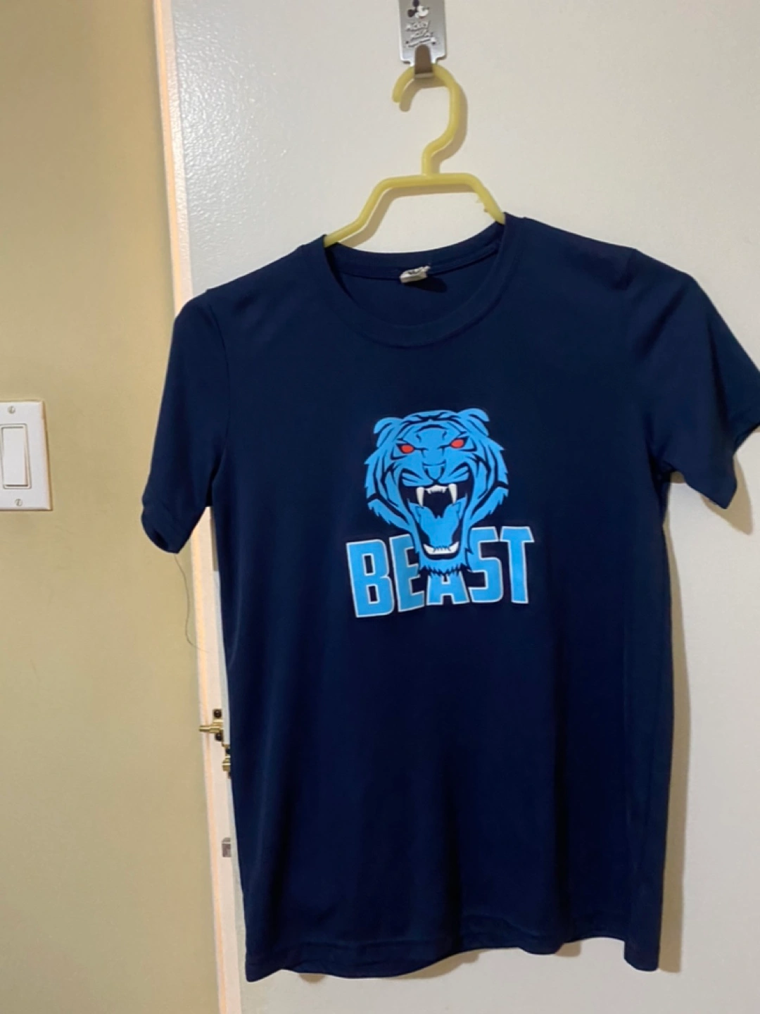 Blue T-shirt with a blue tiger and the word 'BEAST' in white letters. Short sleeves and a crew neck.